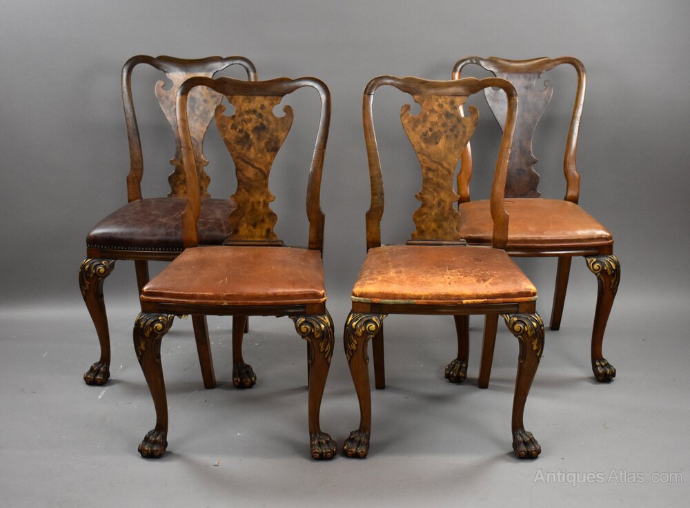 The table stands on four classic Queen Anne stylr cabriol legs on castors each adorned with ornate carved details and impressive claw and ball feet. The set is complemented by four matching dining chairs featuring gently curved backs and coordinating carved motifs.