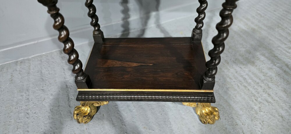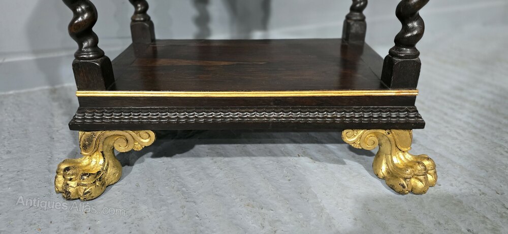 Superb Regency rosewood and parcel gilded side table with barley twist legs lions paw gilded feet and black slate inset top, in excellent overall condition. (possibly Portuguese)28.75" high