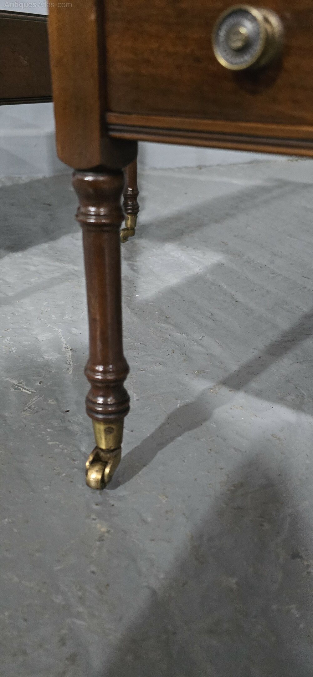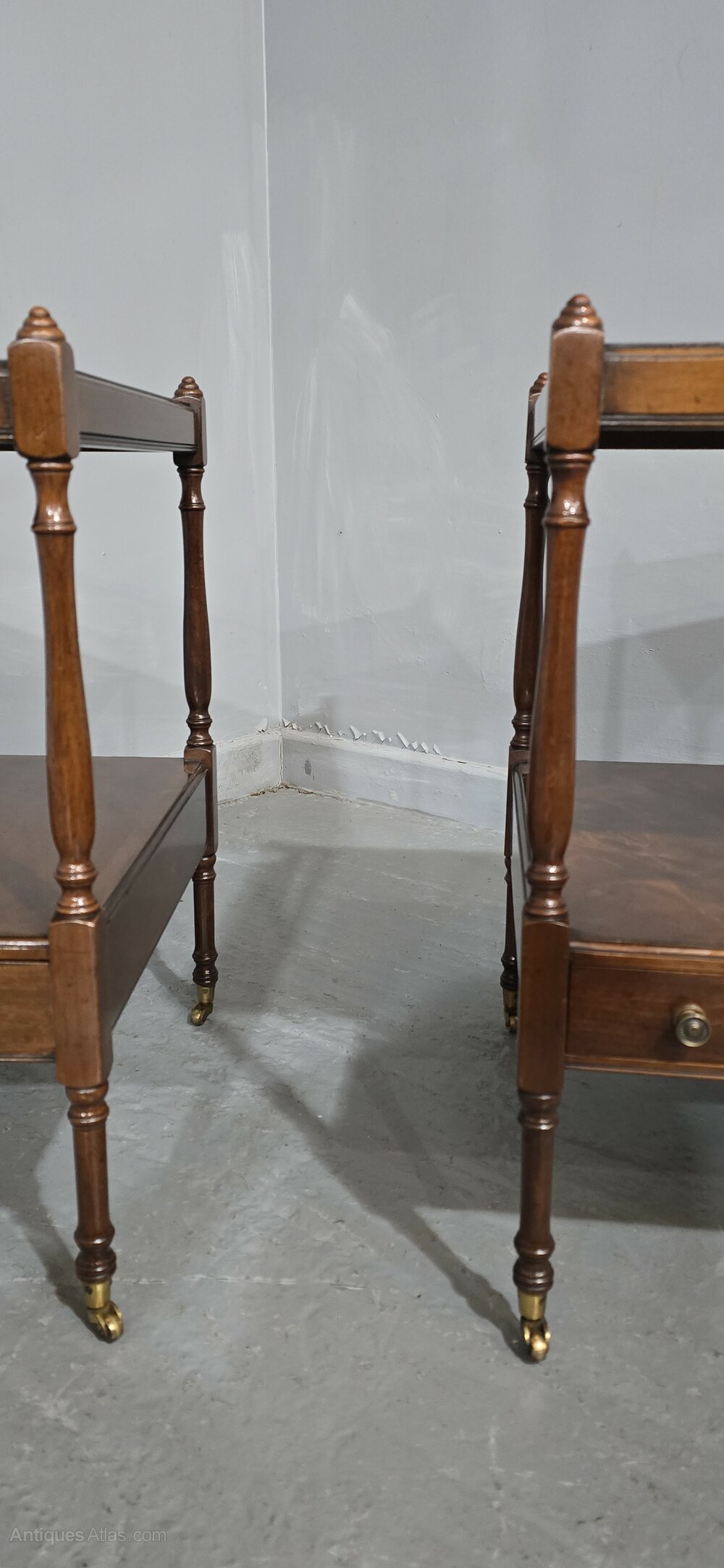 A super pair of Regency style solid mahogany lamp tables, with brass cup castors and knobs, solid drawers, flame mahogany, in excellent overall condition.23" high