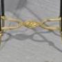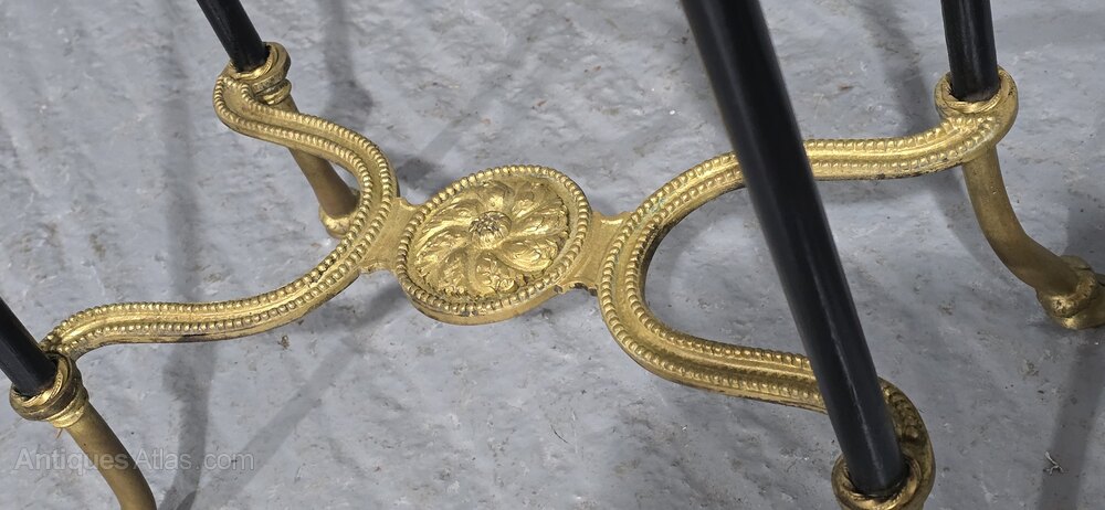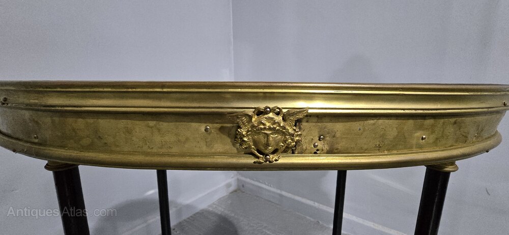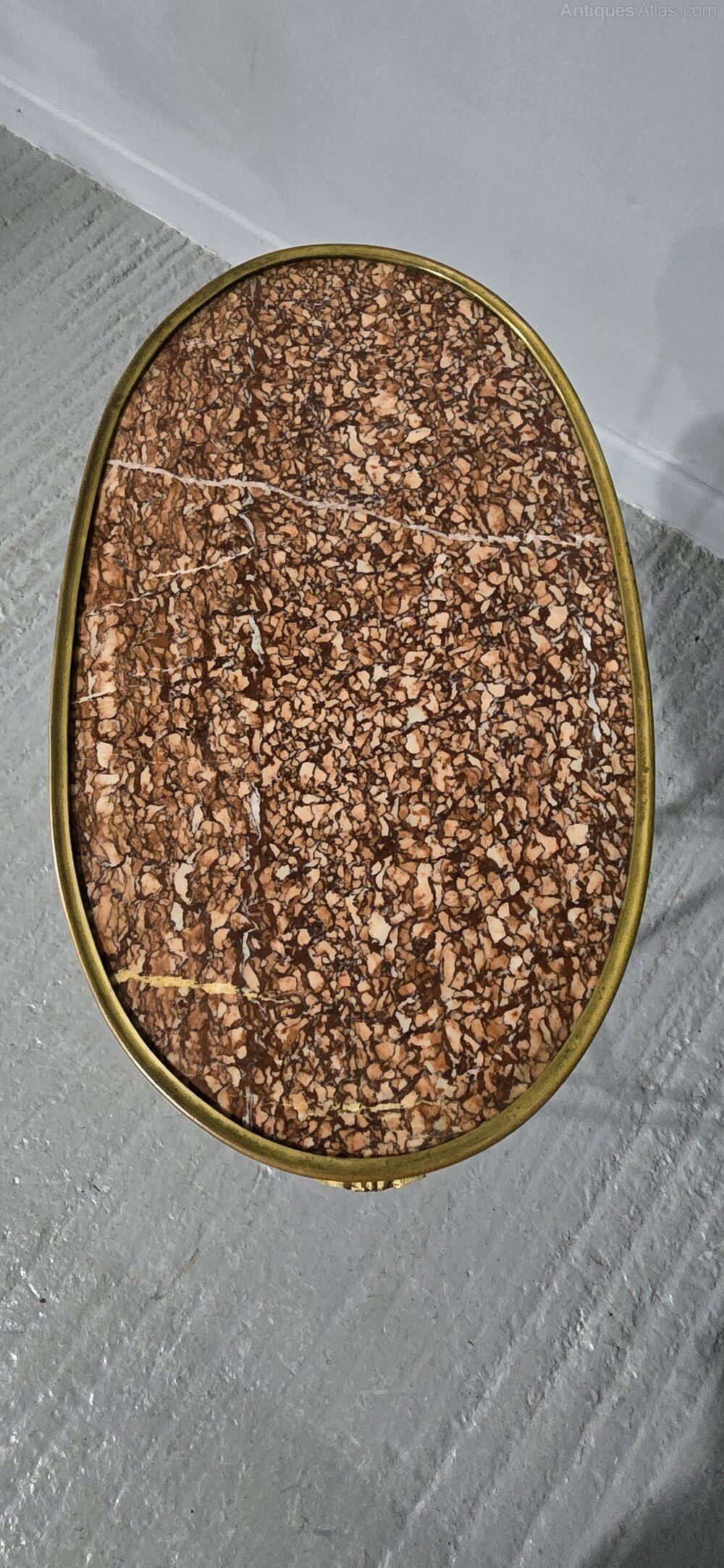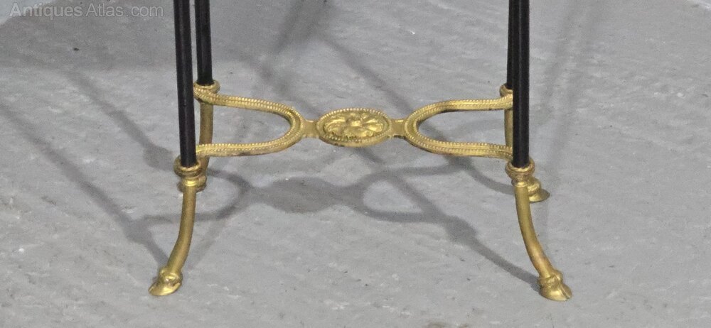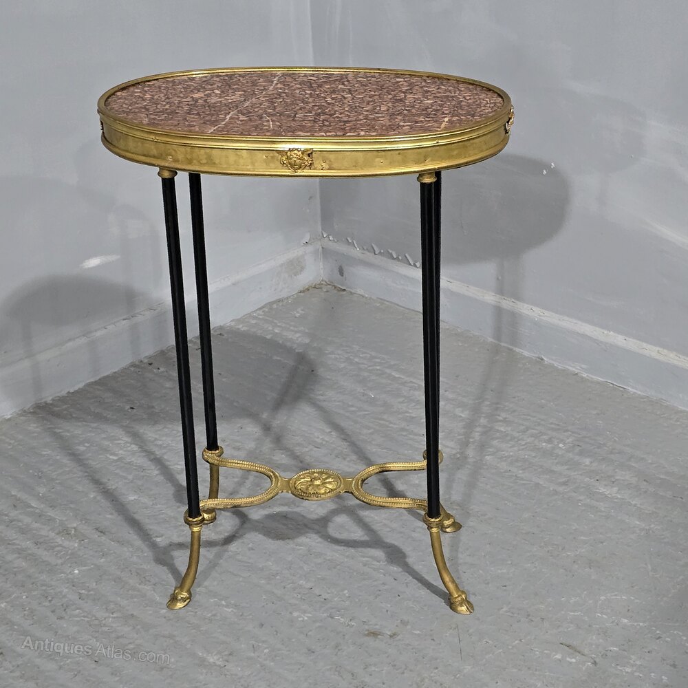 A French fin de siècle ormolu gueridon table, the rouge oval marble top in gilt brass surround with four masks, on black painted iron legs and hoof sabots, in overall lovely condition.30" high