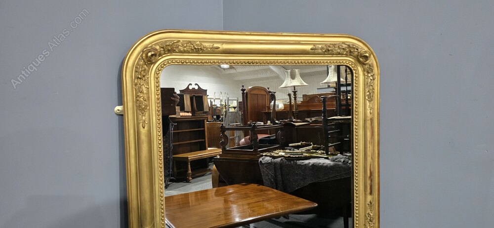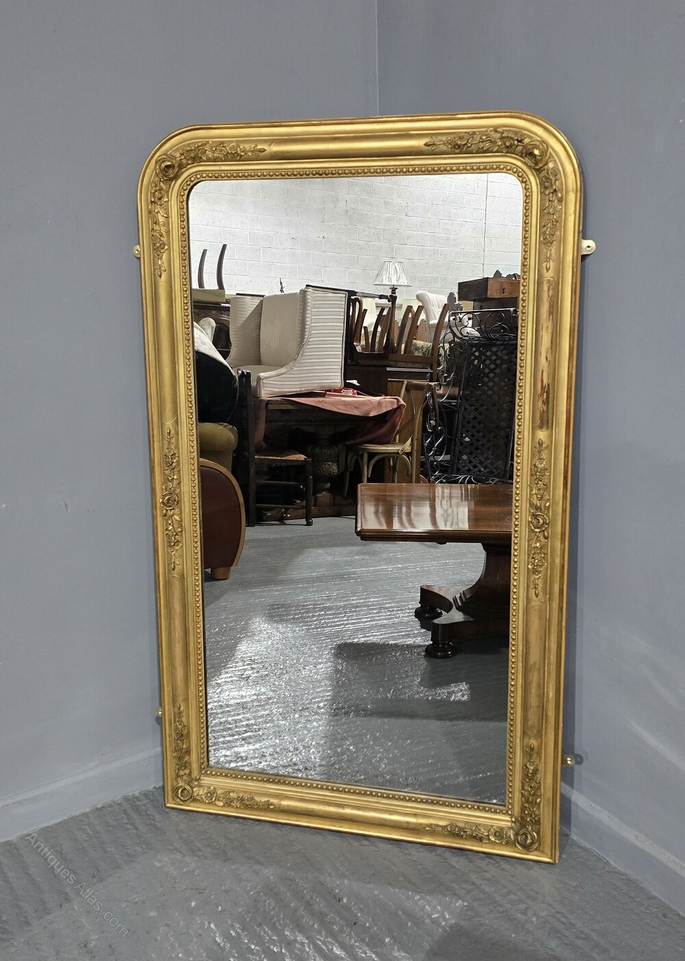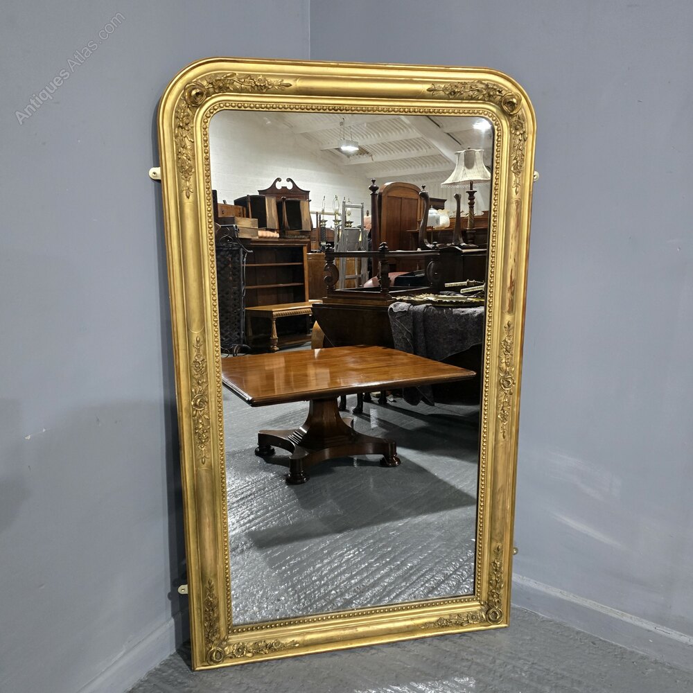 Very attractive mid 19th century antique giltwood wall mirror or console table mirror, having original glass with minor imperfections in beaded and moulded frame decorated with flowery motifs throughout. This antique mirror retains its original glass, gilt and backboard, all in home ready condition.Height 61