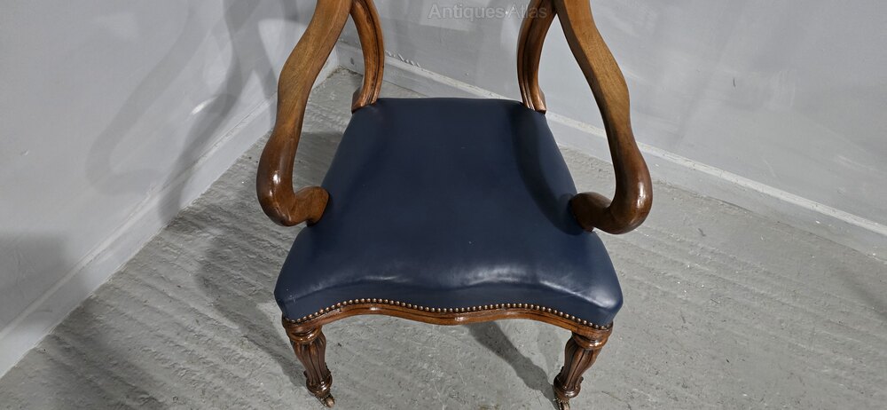 A superb quality early Victorian desk chair with blue leather serpentine fronted seat, in excellent overall condition.37" high
