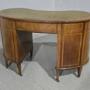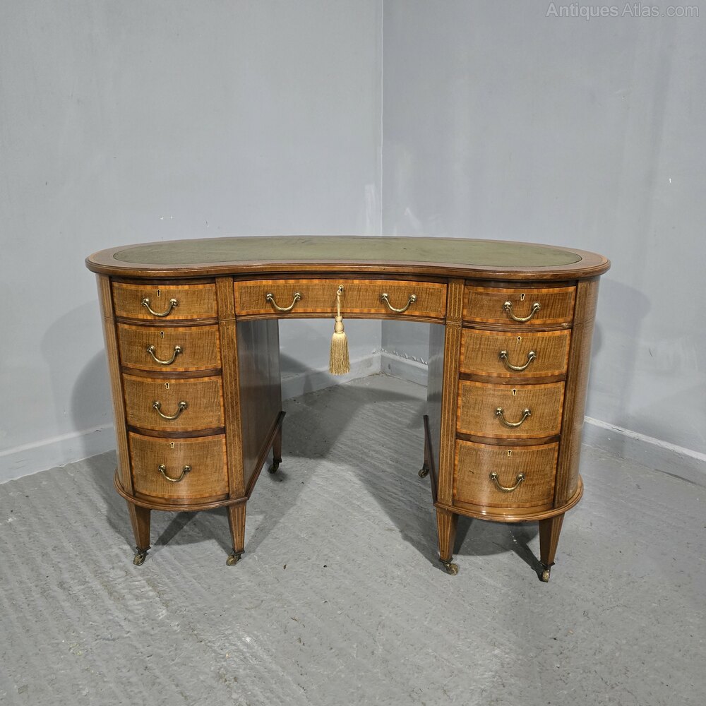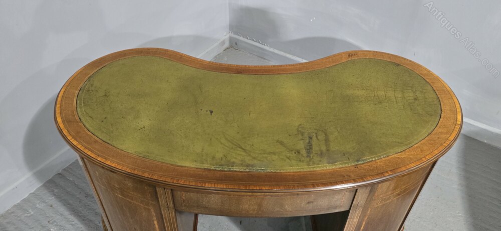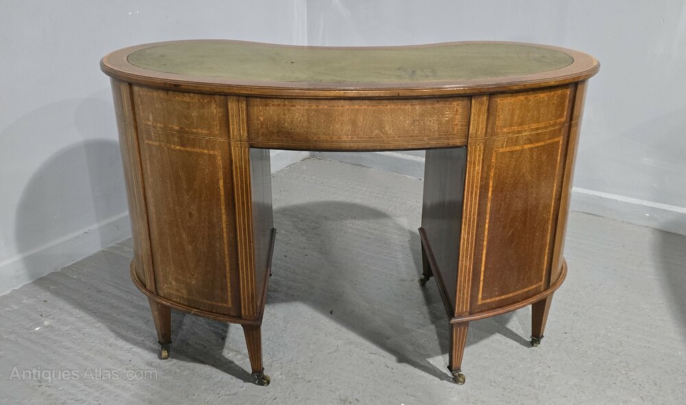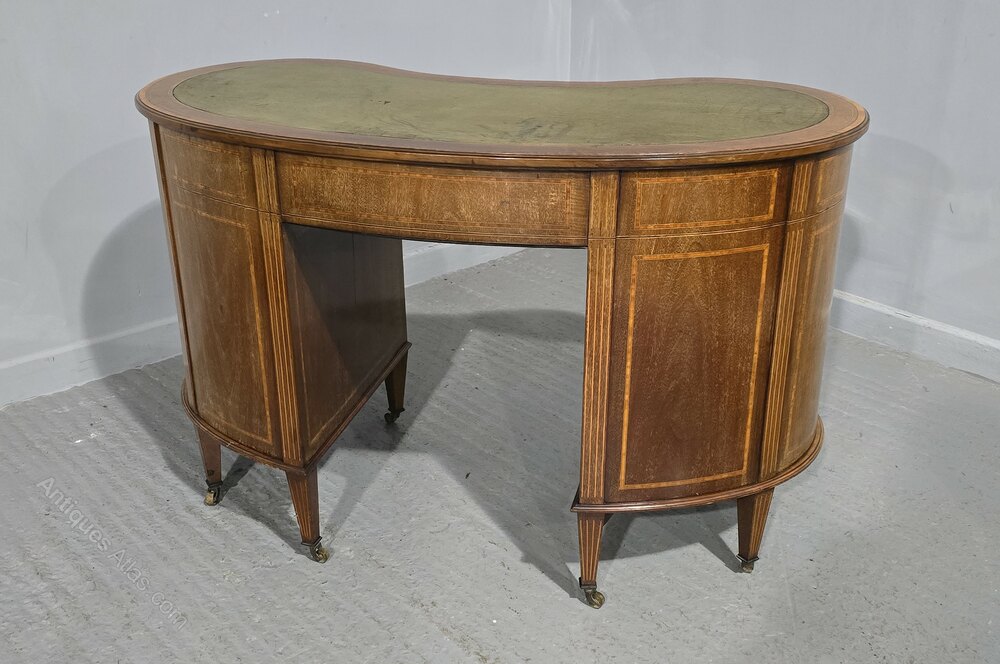 A very nice quality solid mahogany Edwardian serpentine desk with satinwood banding and green leather top, gilded swan neck handles, working locks, in overall excellent original condition.29.75" high