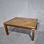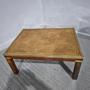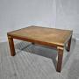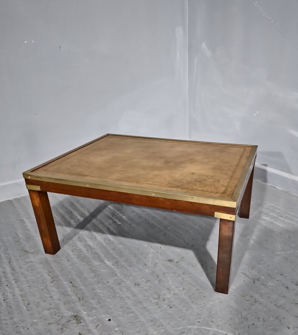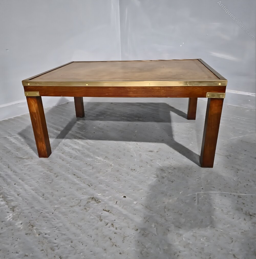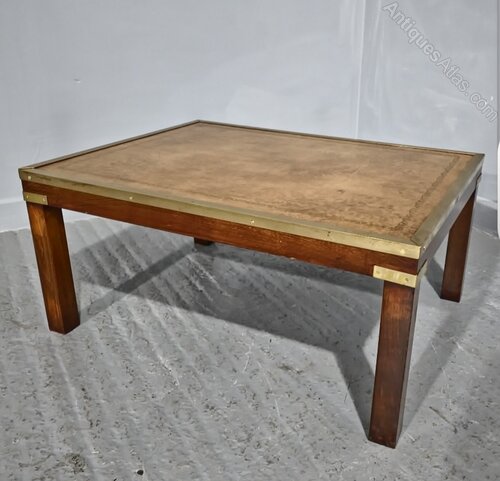 A fine quality leather topped mahogany campaign coffee table, with inset strapps and brass edge, excellent overall condition.14" high