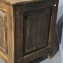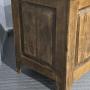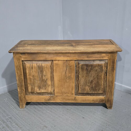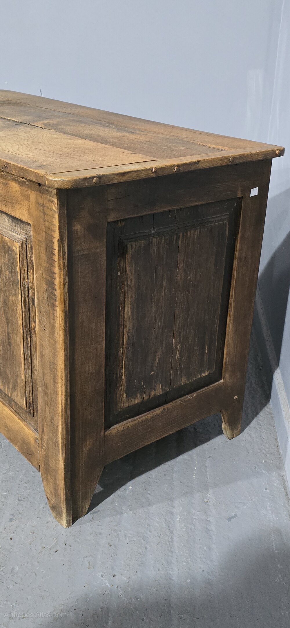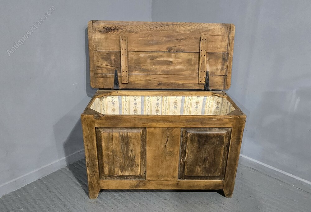 A good French oak rustic four panel coffer, original fabric lining, in good overall condition.30.5" high