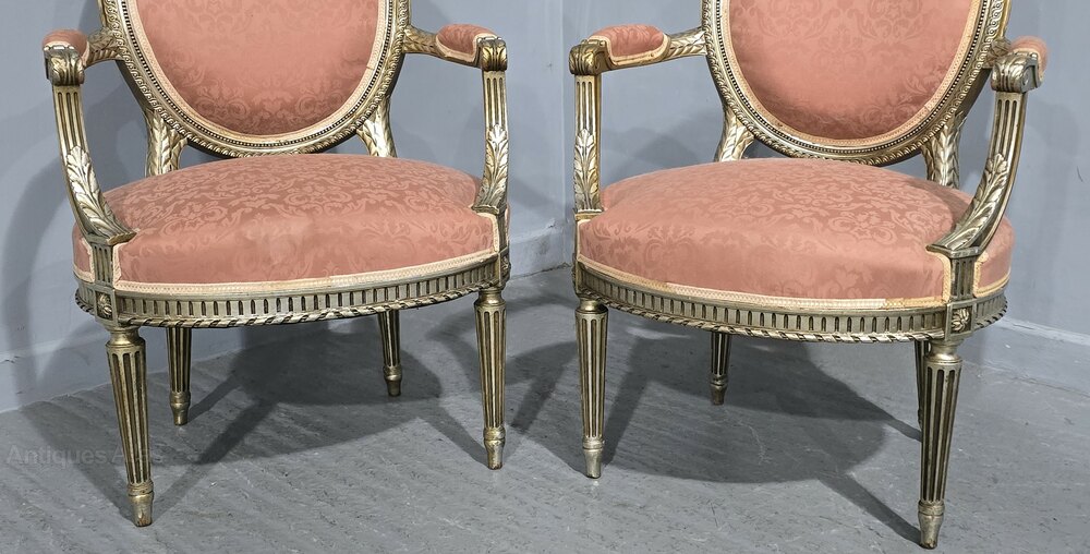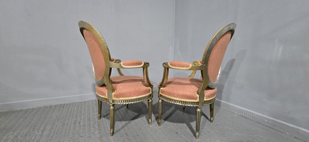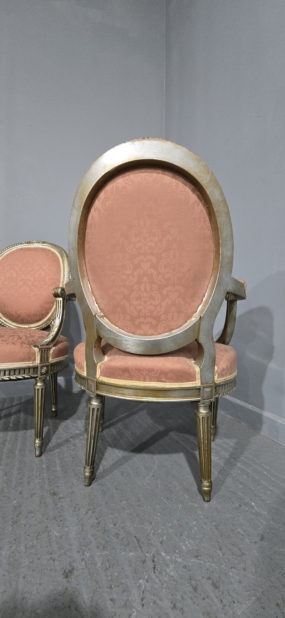 A nice pair of Louis X1V salon chairs, original upholstery, in very good overall condition.37" high