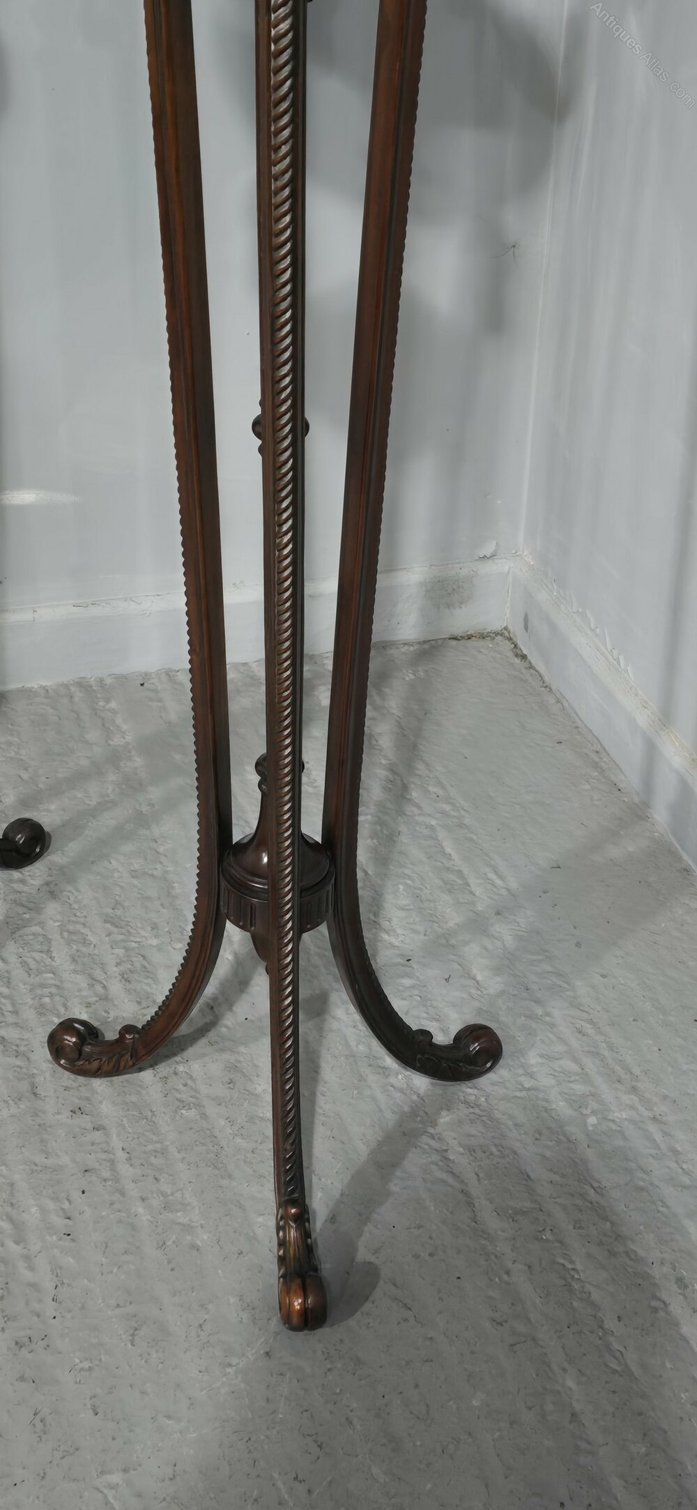 A fine air of mahogany pedestal/torchere stands, with very crisp carvings and in wonderful original condition.54" high
