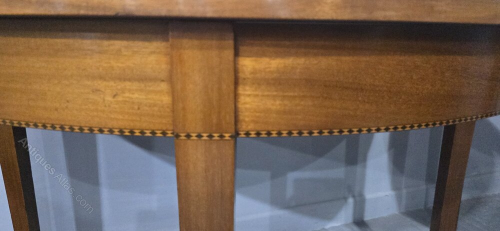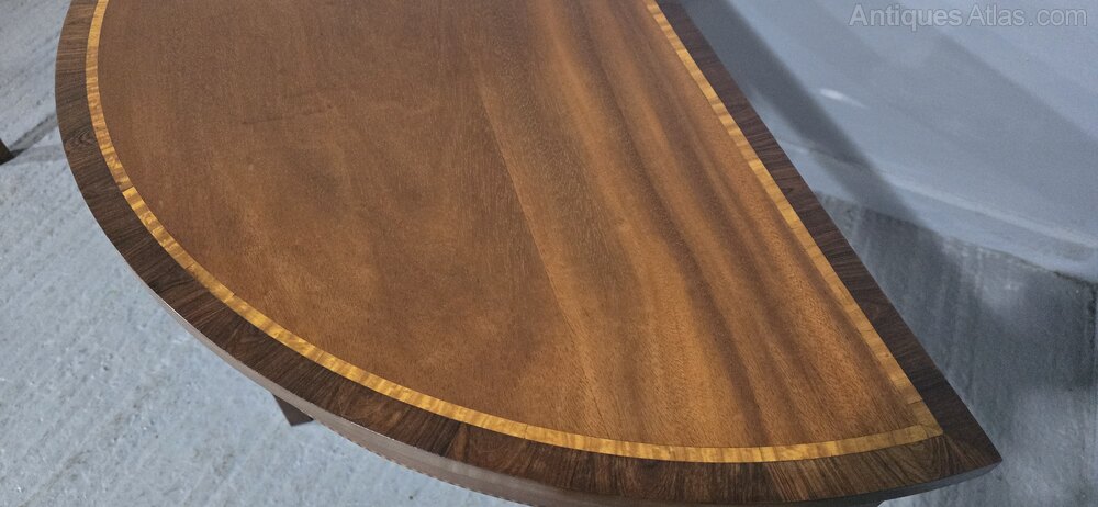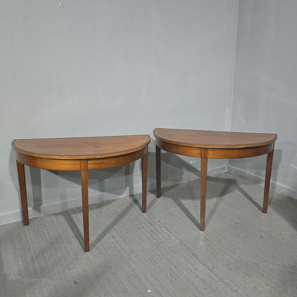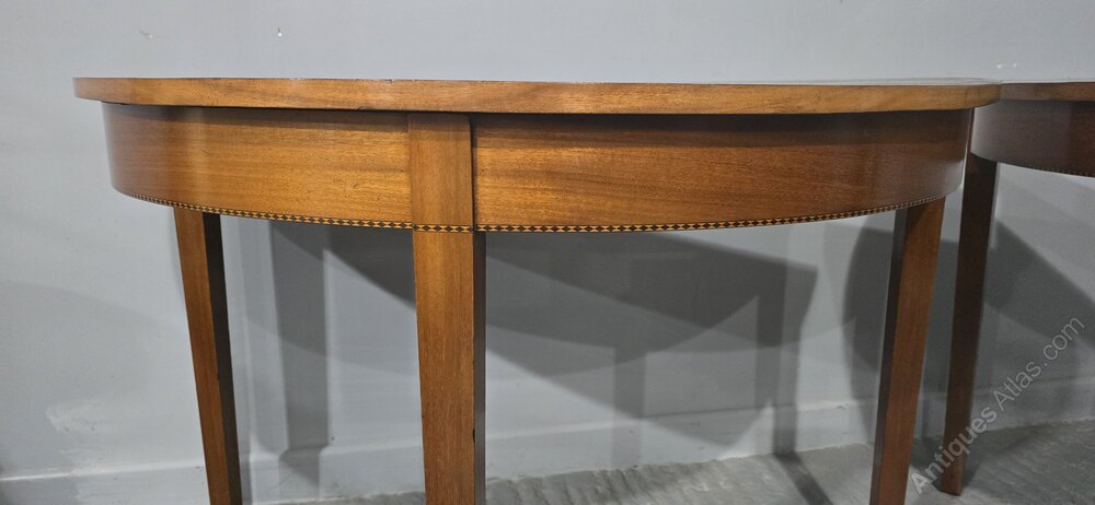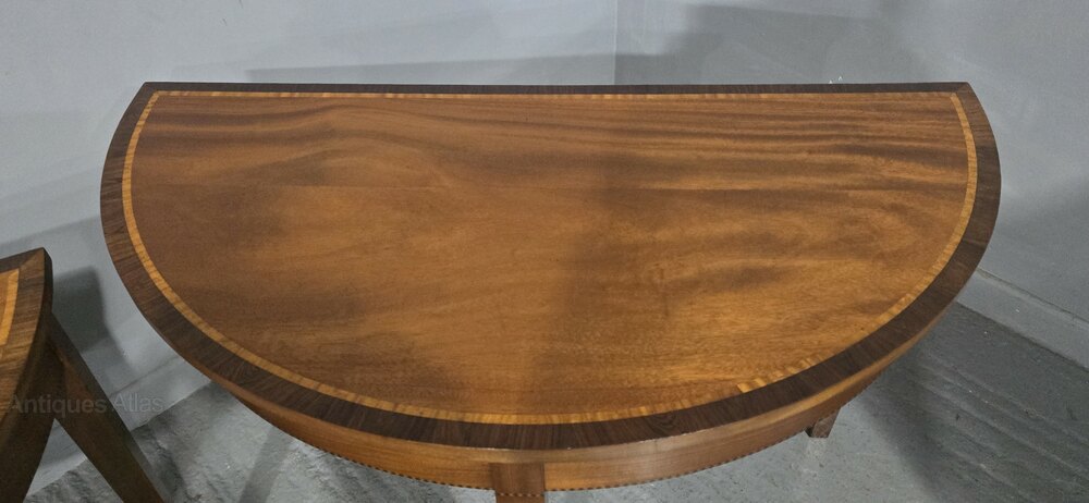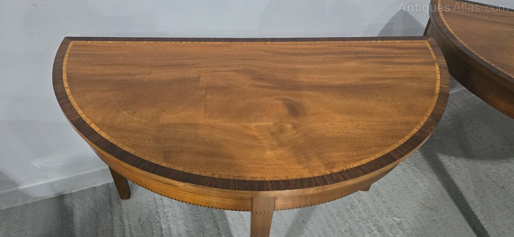 A very nice pair of Regency style mahogany console tables, crossbanded with rosewood and satinwood, in very good overall condition.29" high