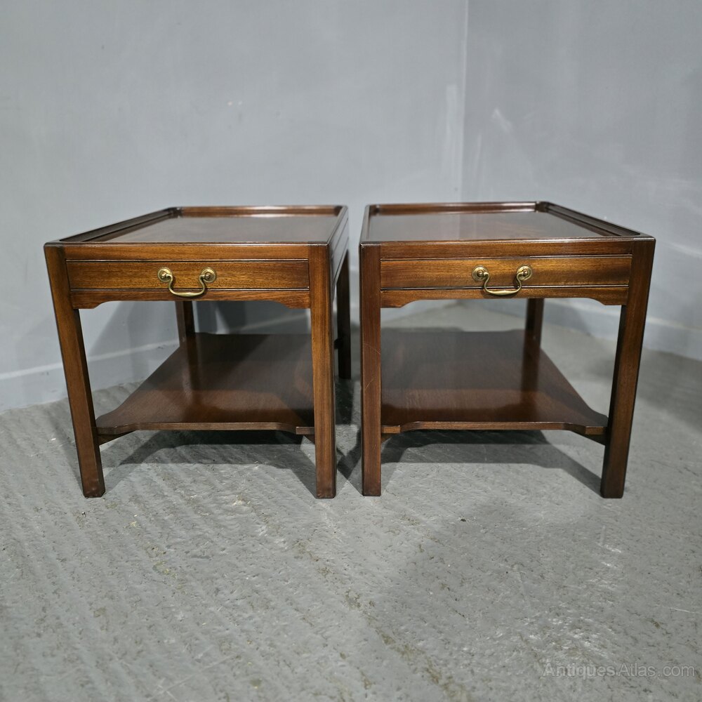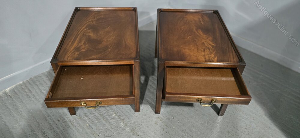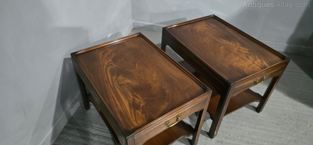 A very nice pair of solid flame mahogany end, lamp tables, tray topped each with a single drawer and undertier, in very nice condition having been waxed and cleaned in our own workshops.20" high
