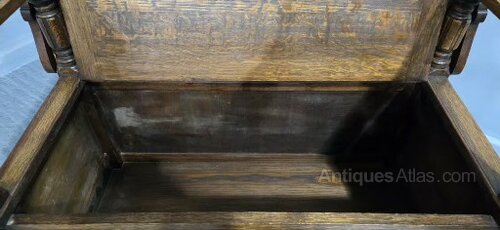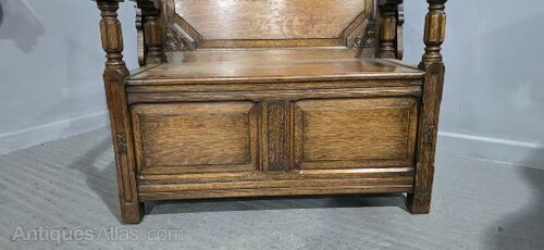 A very good medium oak hall bench, top swivells over to create a table, lift up lid for storage, excellent colour and condition.37" high