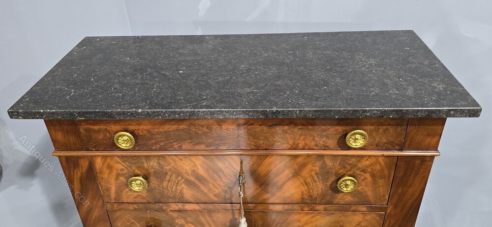 A super quality French six drawer mahogany chest of drawers with stunning gilt handles and original working key, oak lined throughout and with a black marble top, bottom two drawer are actually a single drawer, lovely colour and condition.57.5" high