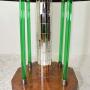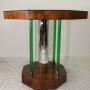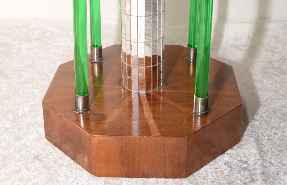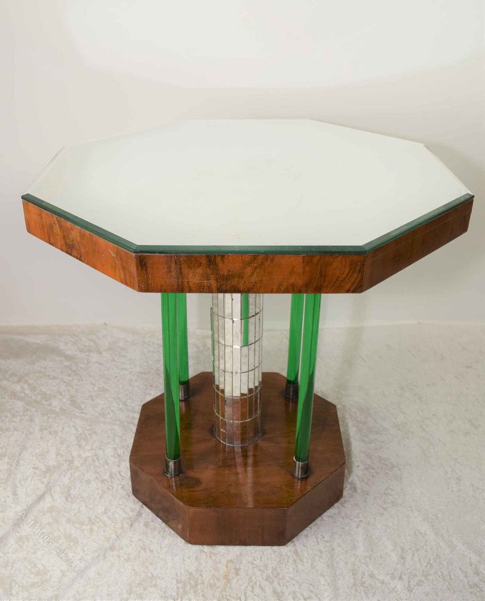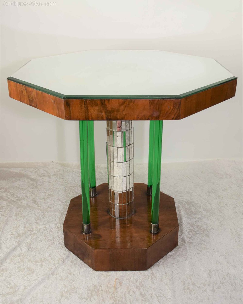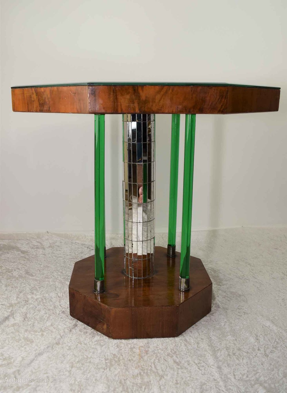 A wonderful, exquisite example of an Art Deco walnut octagonal occasional/lamp table. The tabletop has a bevelled mirrored glass top, raised on a central stem, covered in small rectangular mirror sections. There is four green "Glass Effect" pillars supporting the central stem terminating with a metal-bound banding at the top and bottom of each "pillar". The central stem and four pillars sit on an octagonal walnut veneered base. The mirror top does have some foxing, marking and scratches to it, consistent with the age of the table!DateArt Deco :