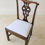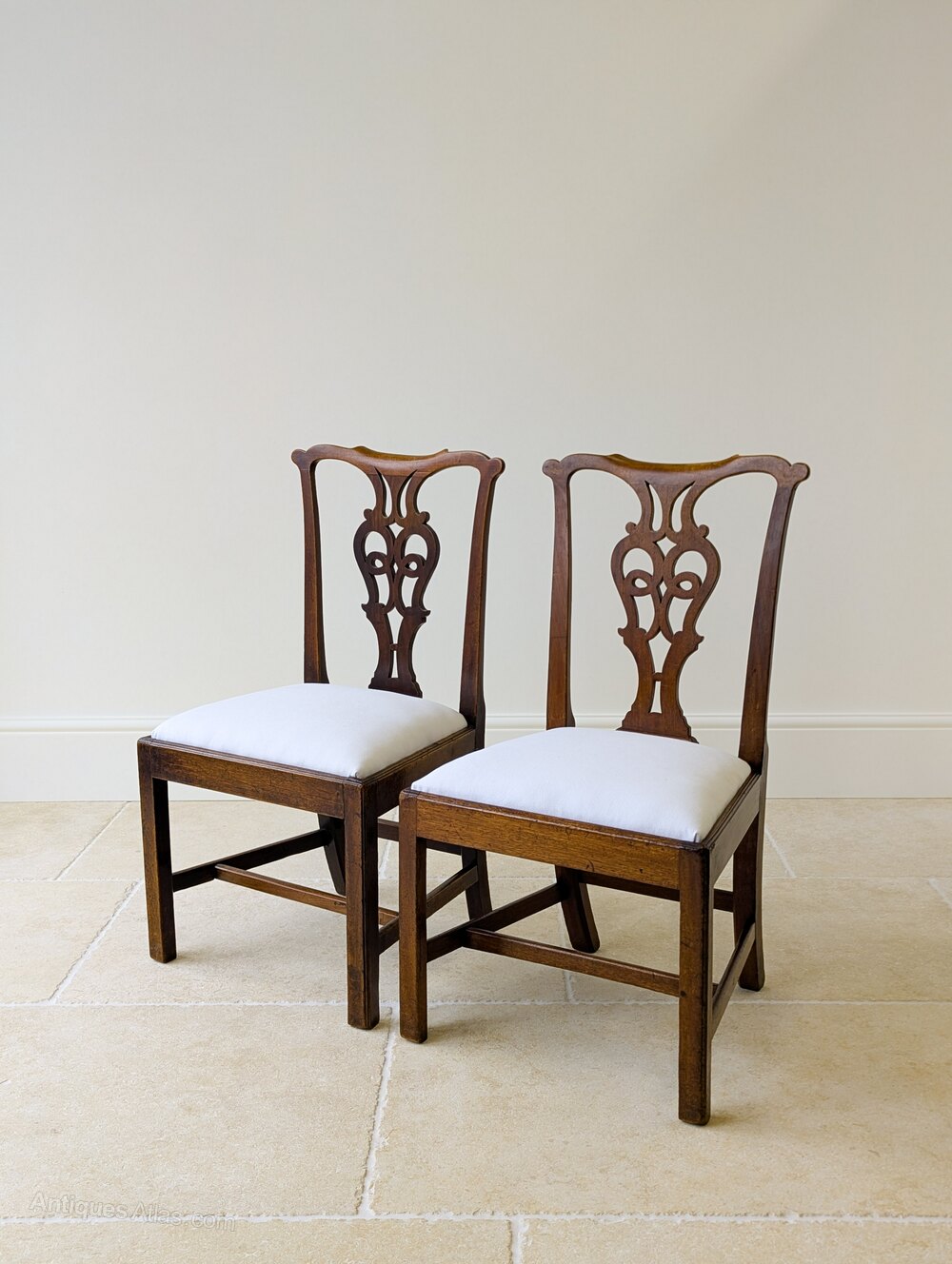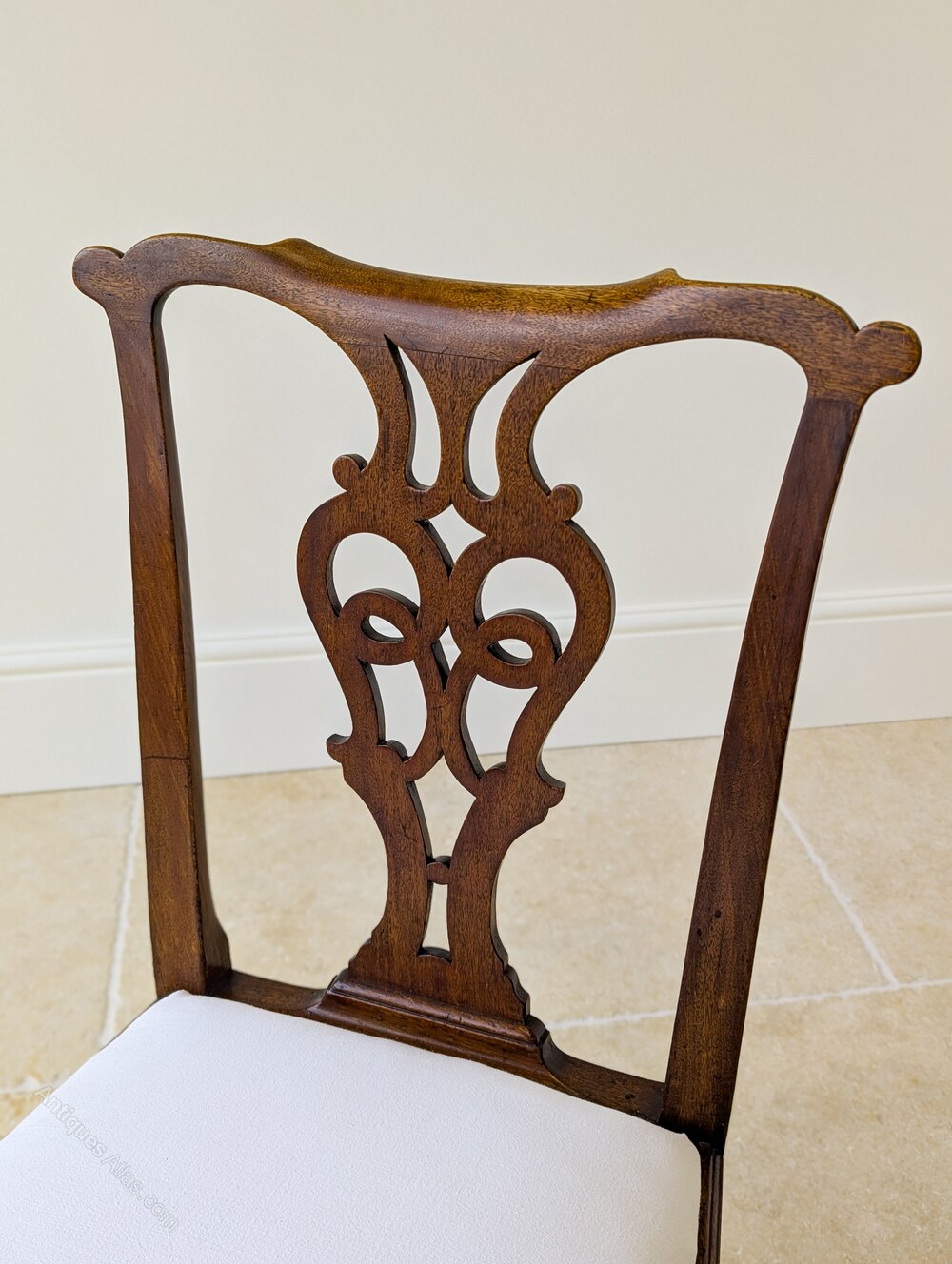 A set of four Georgian mahogany dining chairs in the Chippendale style, each finely constructed with a shaped crest rail above a pierced interlacing splat, over a drop-in seat and square subtly chamfered legs united by an arrangement of stretchers. The seat rails are detailed with a fine incised moulded edge, and the mahogany shows the depth of colour and close grain associated with fine 18th-century timber.With excellent character and a warm, natural patina built from centuries of use, the restrained Chippendale-influenced design ensures timeless versatility. As a group of four they form an elegant small dining set, but are equally well suited as side chairs in a hall, study or bedroom.