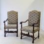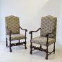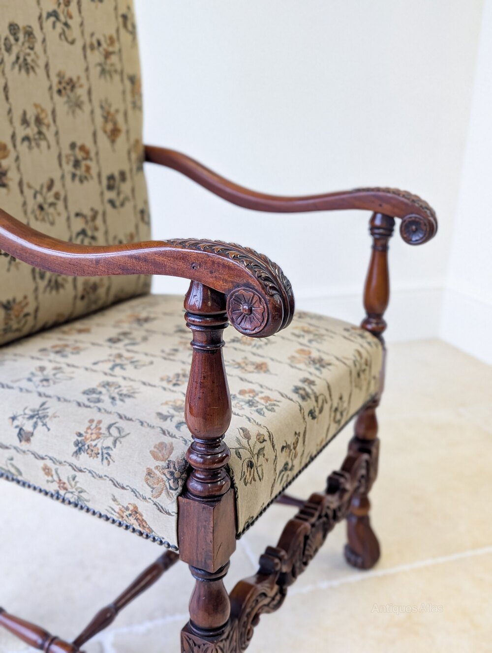 A refined pair of late Victorian walnut open armchairs, each of generous yet well-balanced proportions. The chairs are raised on turned legs with crisply carved block knees and bold lobed feet, united by finely carved front stretchers centred with a shell motif and flowing foliate scrollwork. The shaped open arms are enriched with foliate carving and finished with rosette terminals.Finely upholstered in a traditional floral fabric, they are suitable as occasional armchairs in a drawing room, study or library. As a true matching pair, they work particularly well flanking a fireplace or anchoring a refined seating arrangement in a period interior.