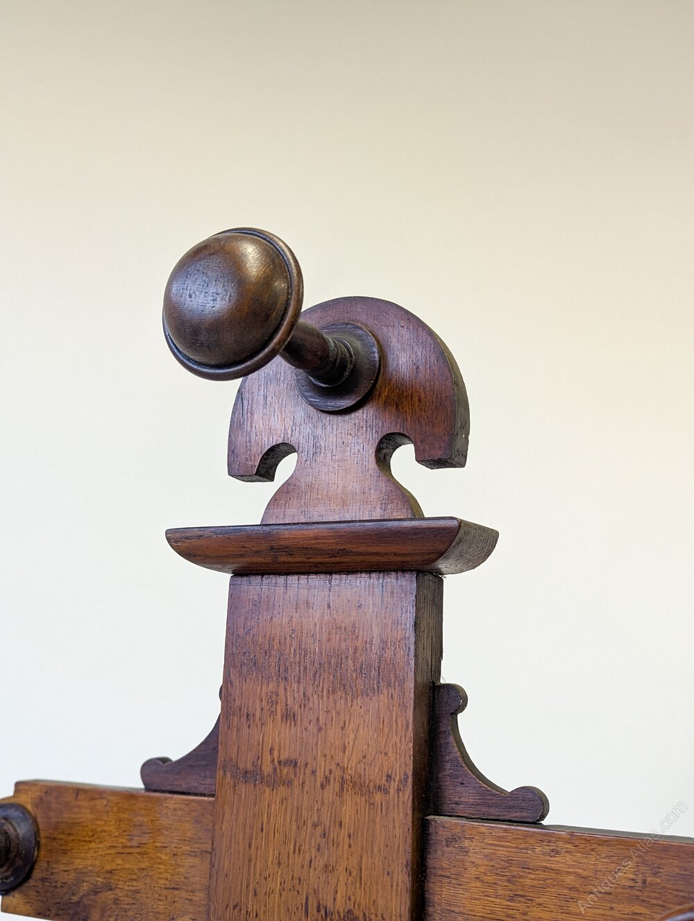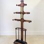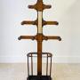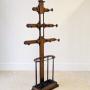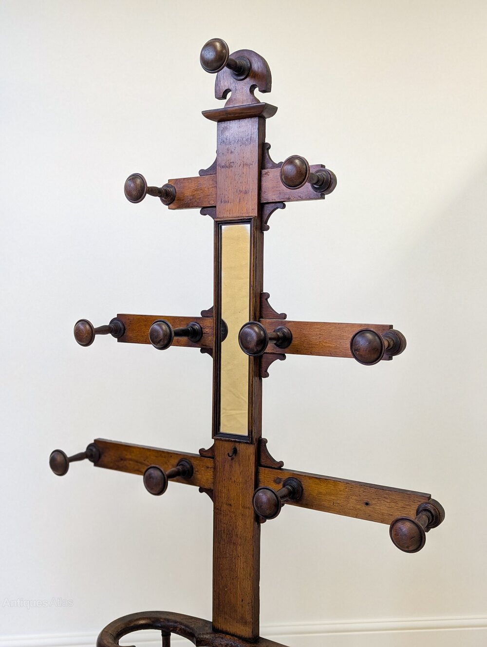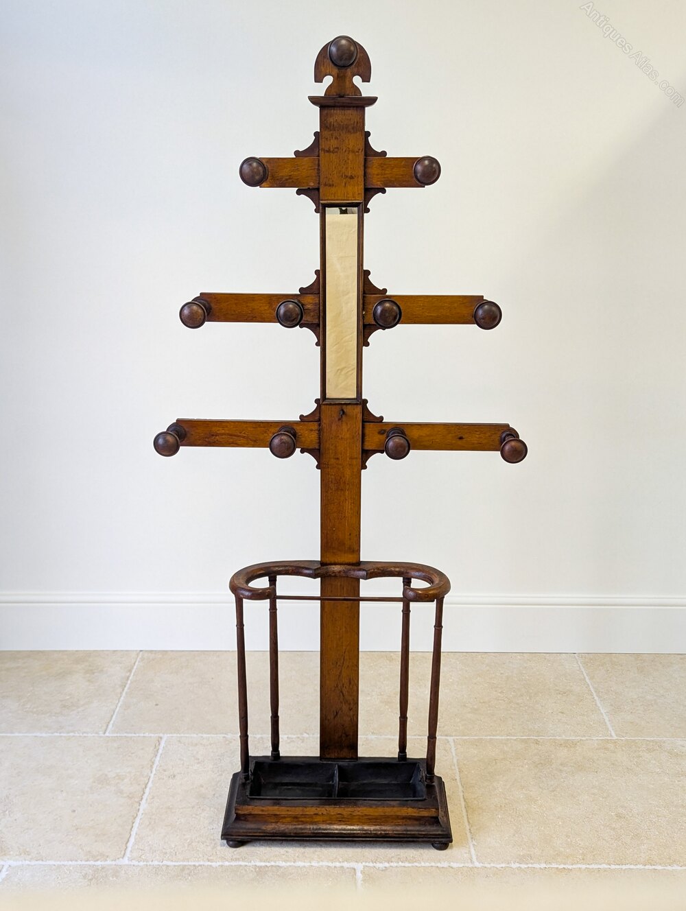 A Victorian oak hall stand of tall and impressive proportions, centred on a vertical upright with shaped cresting and original rectangular mirror plate, fitted with three tiers of horizontal arms carrying turned wooden pegs. Below is a finely shaped integrated umbrella stand with original divided drip tray.A practical piece for hanging for coats and hats in an entrance hall, but with real decorative appeal. The narrow footprint allows it to sit comfortably in tighter hall spaces where floor area is limited.