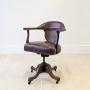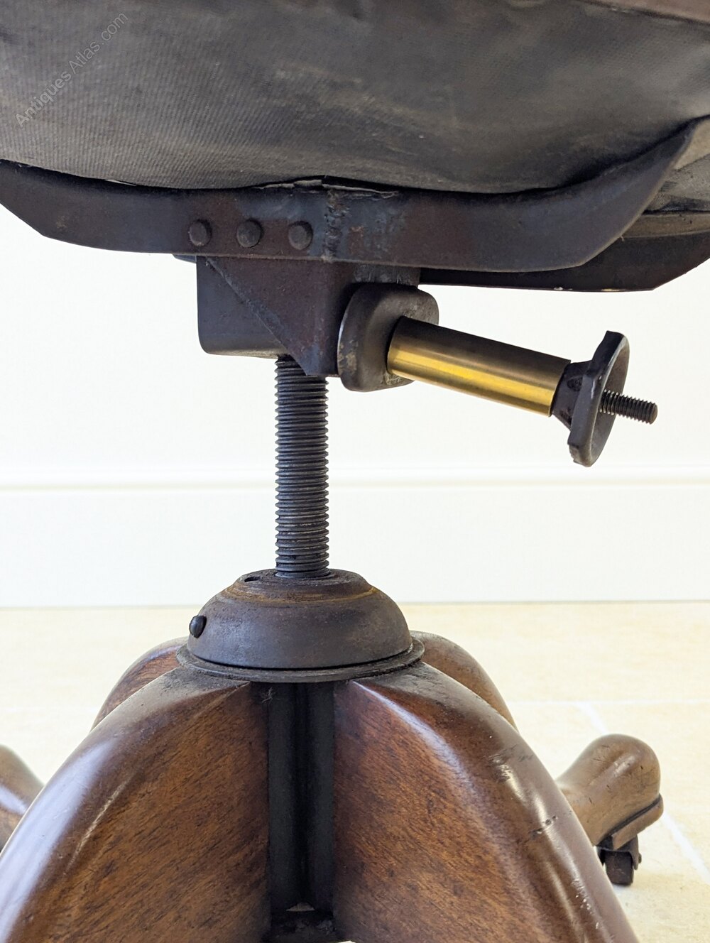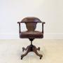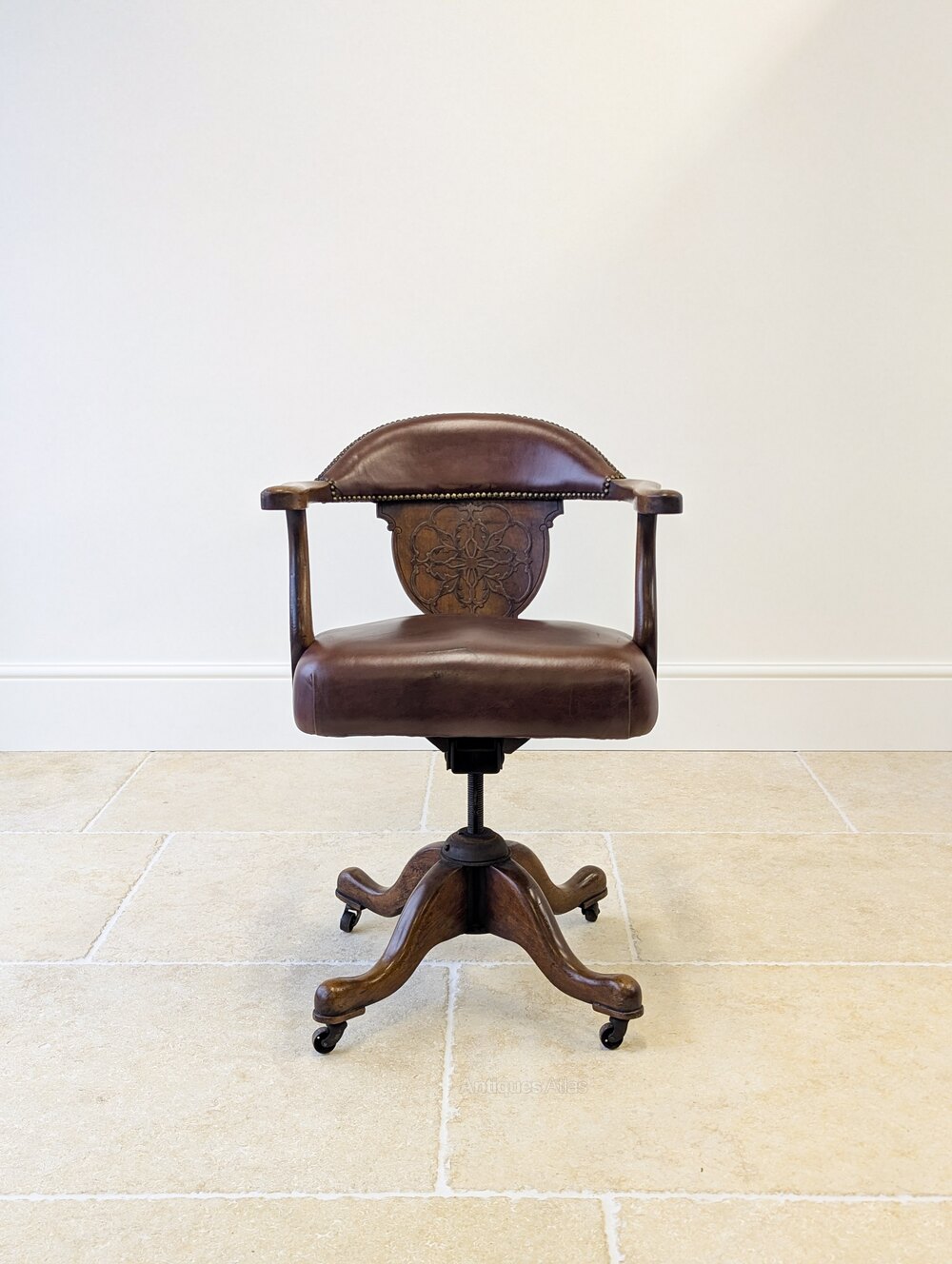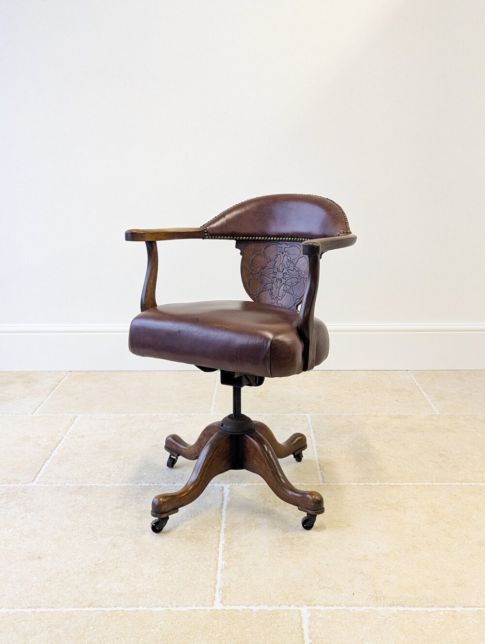A stylish Edwardian mahogany swivel desk chair retaining its original leather upholstered seat and backrest with brass stud detailing, shaped open arms and a carved splat, all raised on a four-legged base with a height-adjustable swivel mechanism and original castors.Manufactured for use in a commercial office rather than a domestic setting, the chair is particularly comfortable and designed for prolonged desk use. Today it would make a perfect desk chair in a home office or library where a characterful but practical working chair is required.