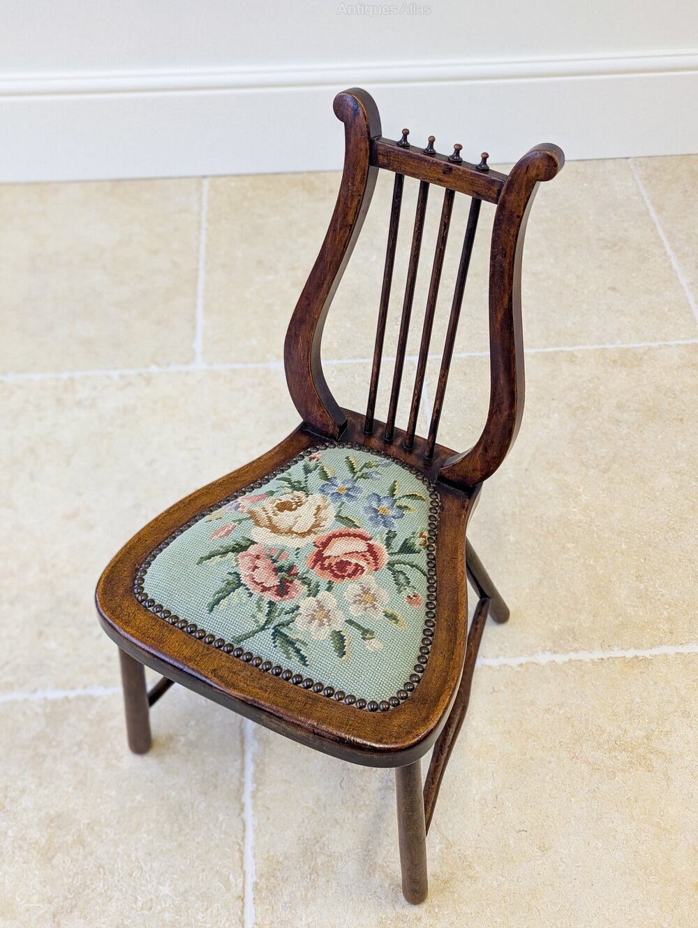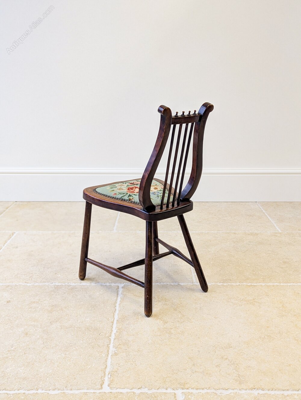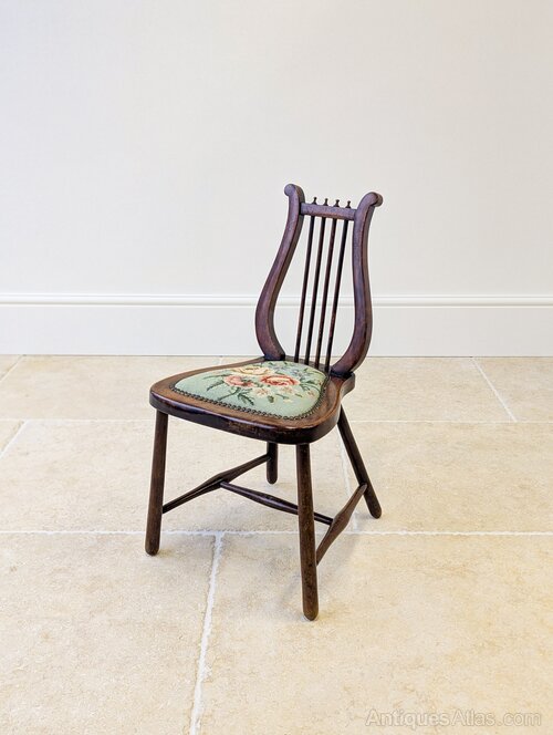 A small-scale beech side chair in the lyre-back form with shaped uprights flanking vertical rods with turned finials to the crest rail. Below, a shaped seat is beautifully upholstered with floral needlework and studded edging, all raised on splayed legs united by a H stretcher.Suited to occasional seating, its modest proportions make it particularly suitable as a hall perch or for decorative placement within a room.