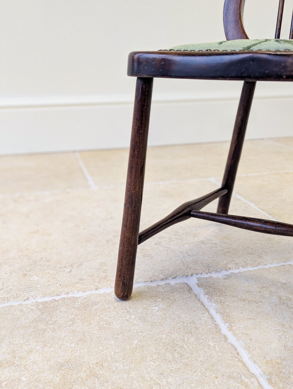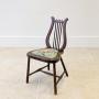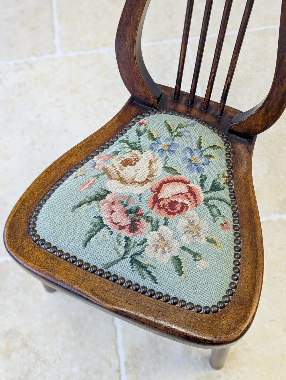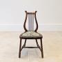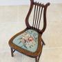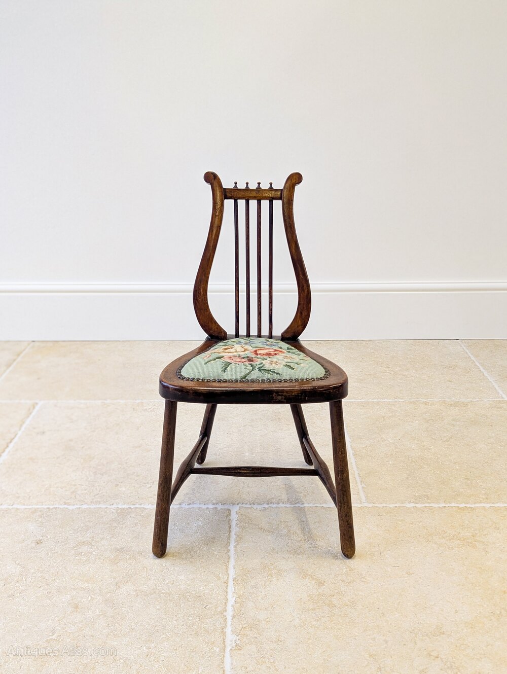 A small-scale beech side chair in the lyre-back form with shaped uprights flanking vertical rods with turned finials to the crest rail. Below, a shaped seat is beautifully upholstered with floral needlework and studded edging, all raised on splayed legs united by a H stretcher.Suited to occasional seating, its modest proportions make it particularly suitable as a hall perch or for decorative placement within a room.