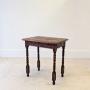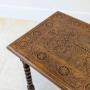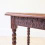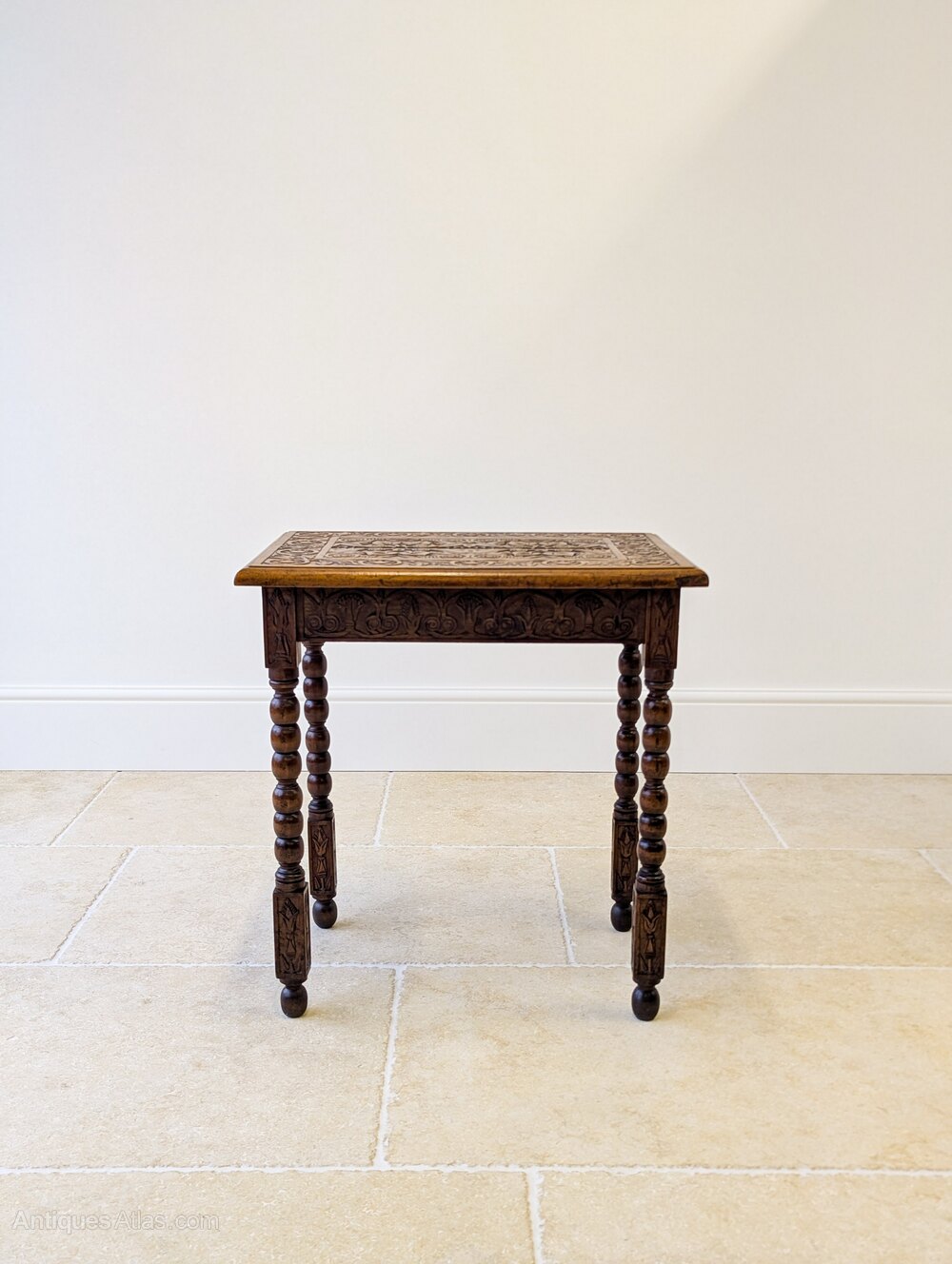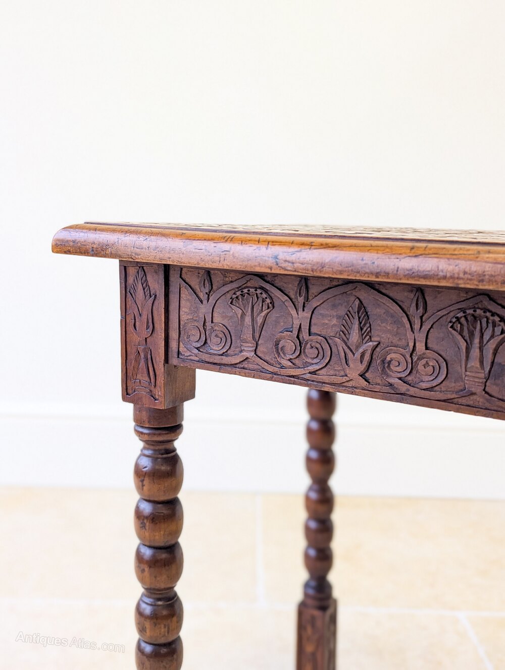 A fine fruitwood carved side table of high decorative quality. The rectangular top is carved with dense foliate and geometric ornament within a bordered field, above a continuous carved apron, raised on bobbin-turned legs with carved block details and bun feet.A later hand-written label to the underside records a local attribution linking the table to Locking Manor in Somerset and to Miss Gimingham, who lived in the Manor House in the 1890s. Miss Gimingham is documented as running wood-carving activity there around the turn of the 20th century. The note also refers to an “Egyptian motif” and “El Teb”, neither of which are supported by the table’s European decorative vocabulary.