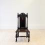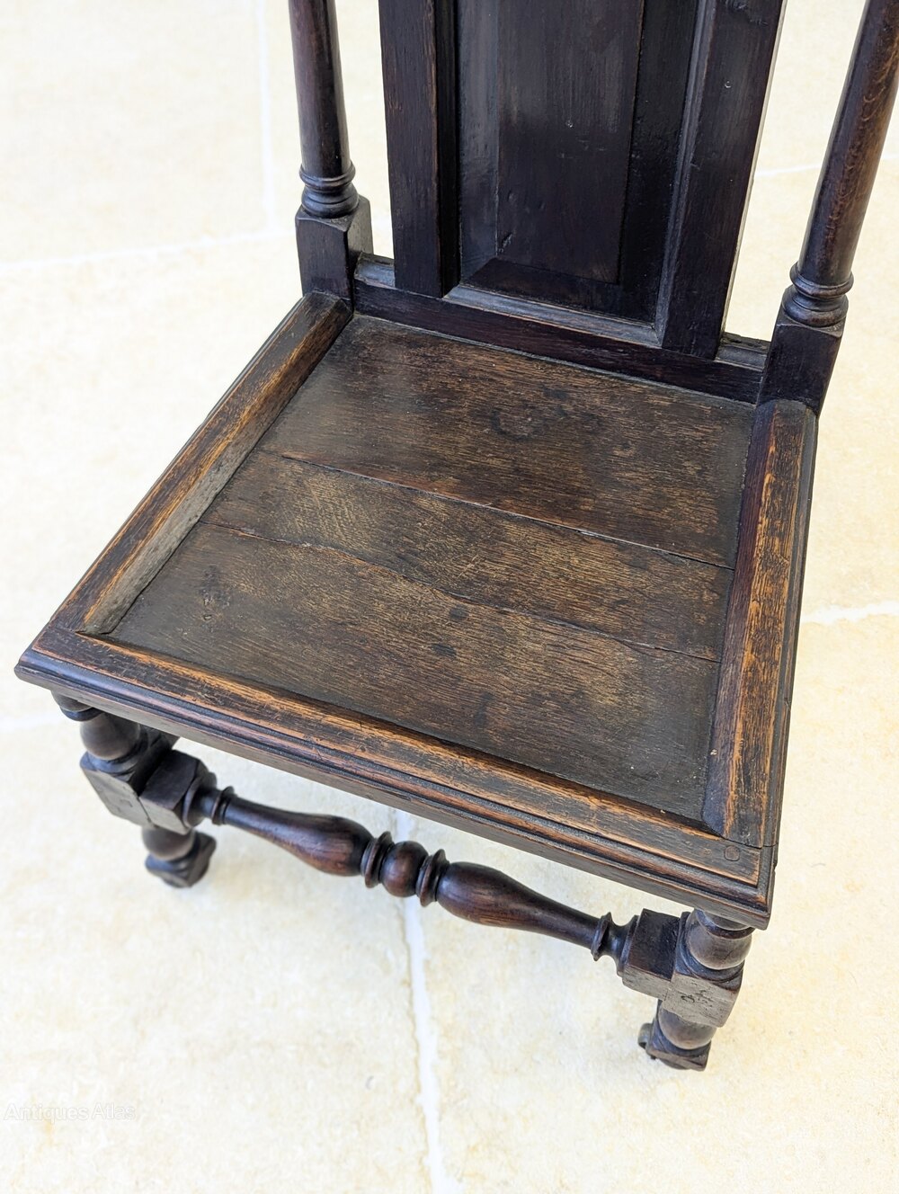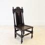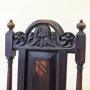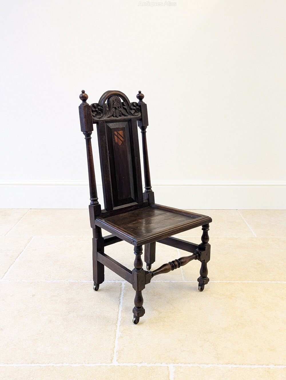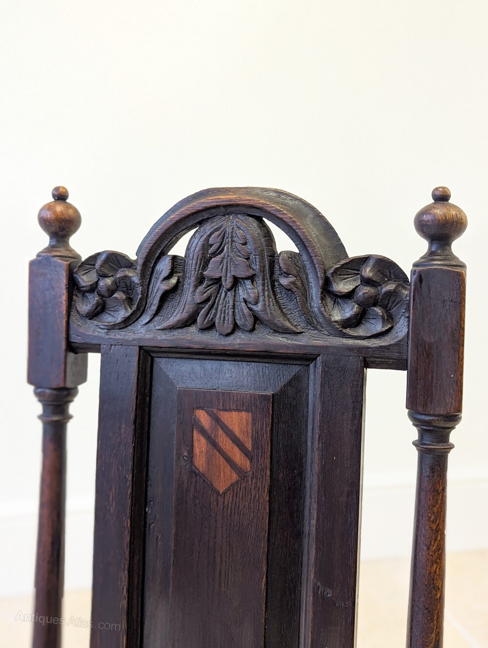 A Victorian oak hall chair with a tall, panelled back over a framed plank seat, raised on turned front legs united by stretchers and terminating in brass castors. The back is surmounted by a carved foliate crest and features a central panel with an attractive inlaid shield motif.Very good antique condition with some wear consistent with age. Structurally sound, clean and ready to place.