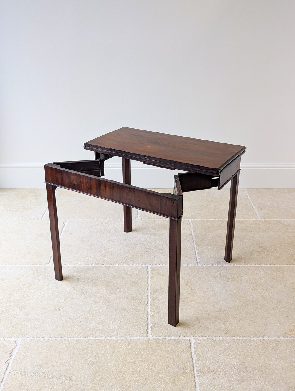 A quality Regency mahogany concertina card table. The top folds open to a green baize playing surface, supported by the original concertina mechanism including a sliding locking bar with integrated card tray, all raised on square chamfered legs.When closed it serves naturally as a conveniently narrow side table in a hallway or living space, and when required it opens for use as a sociable card table.