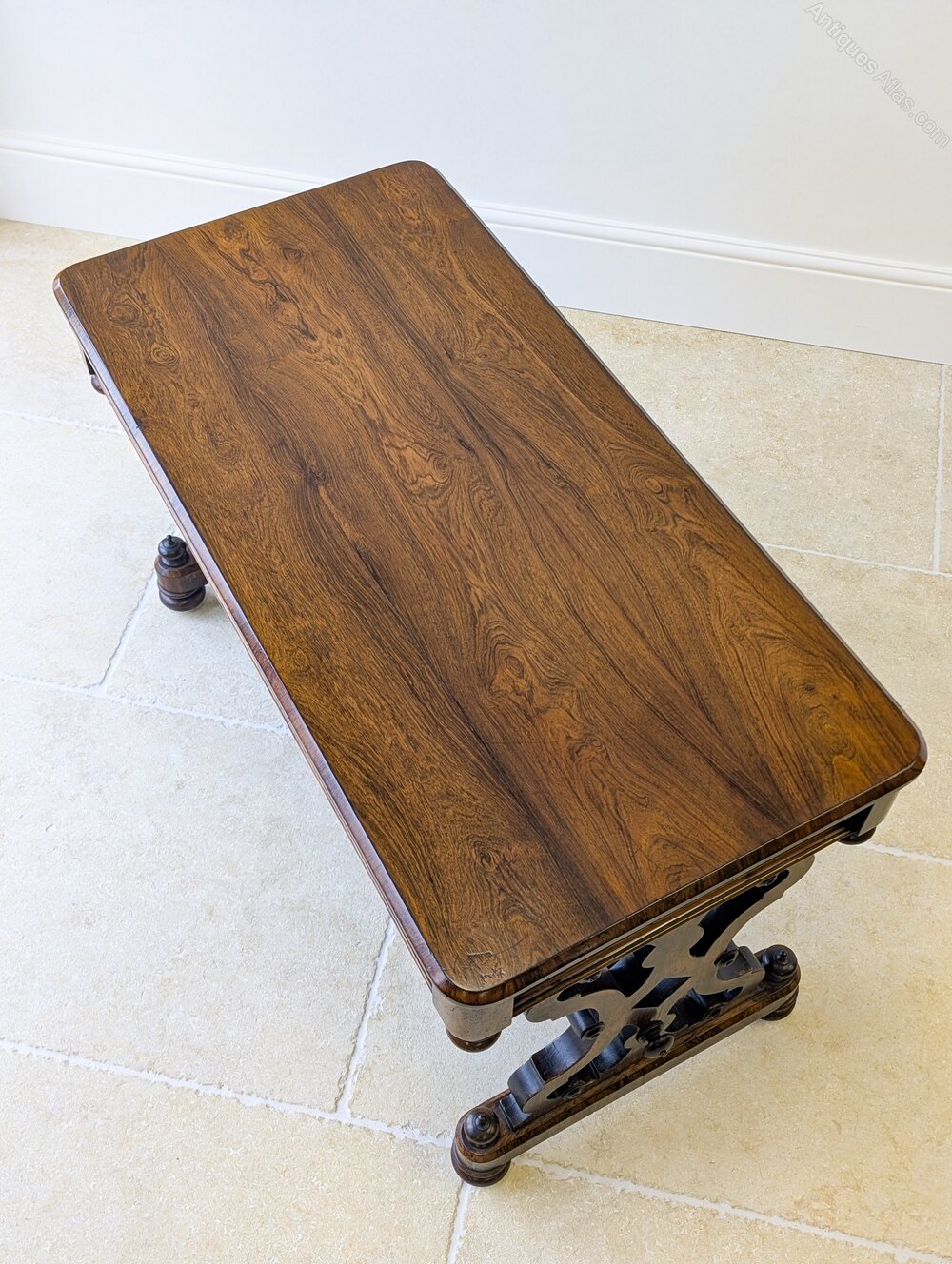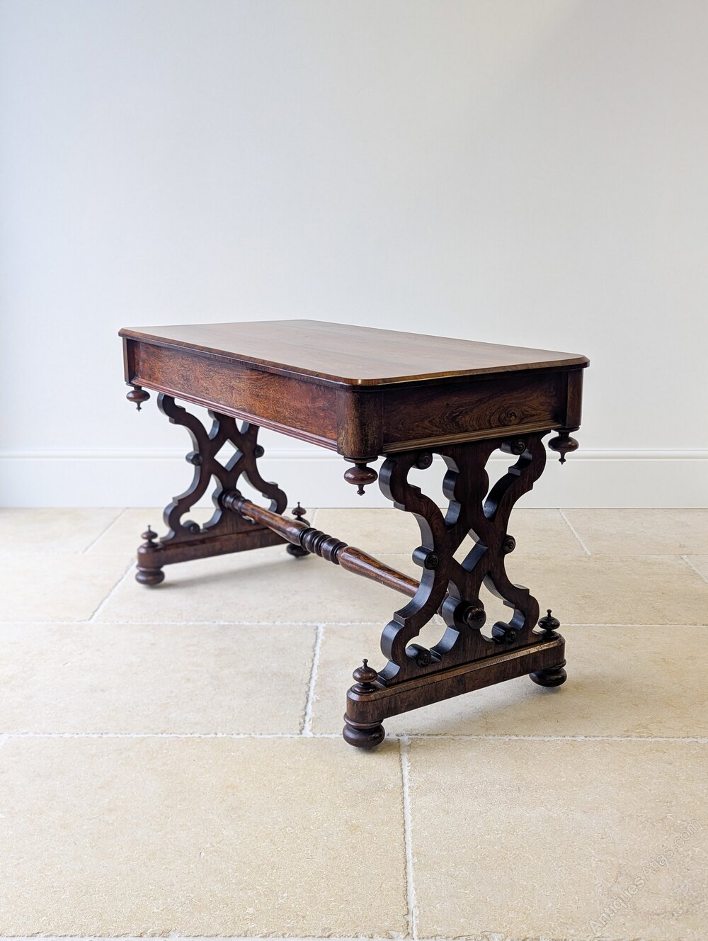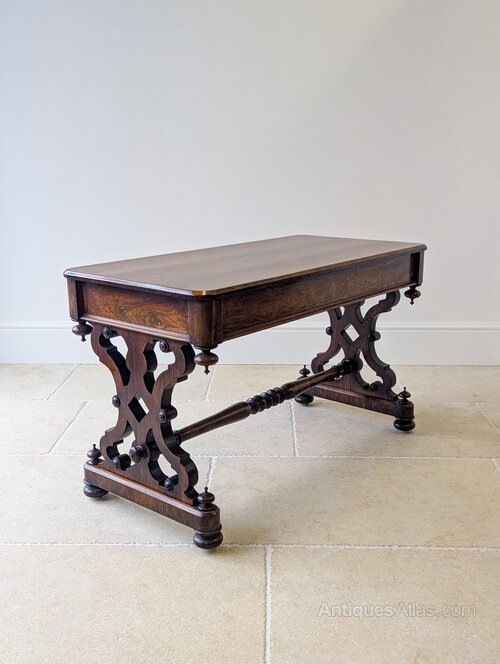 A fine Victorian rosewood library table of generous proportion. The rectangular top sits above a deep apron with turned pendant drops, raised on decoratively shaped pierced trestle ends with applied bosses and a central turned stretcher.Designed for writing and reading, it works beautifully as a centre table in a library or study, or as a substantial console in a large hall or living space.