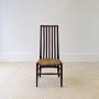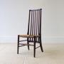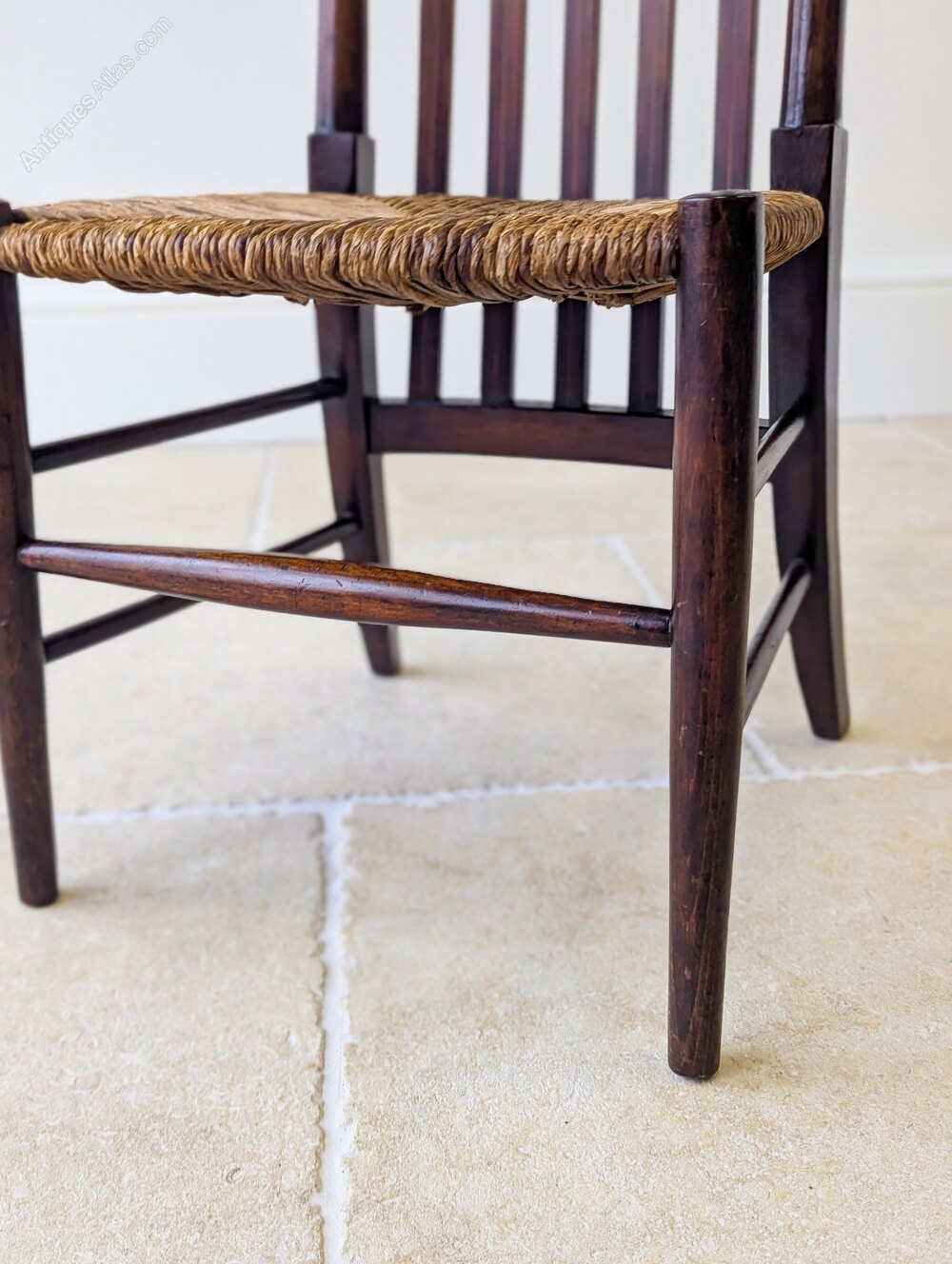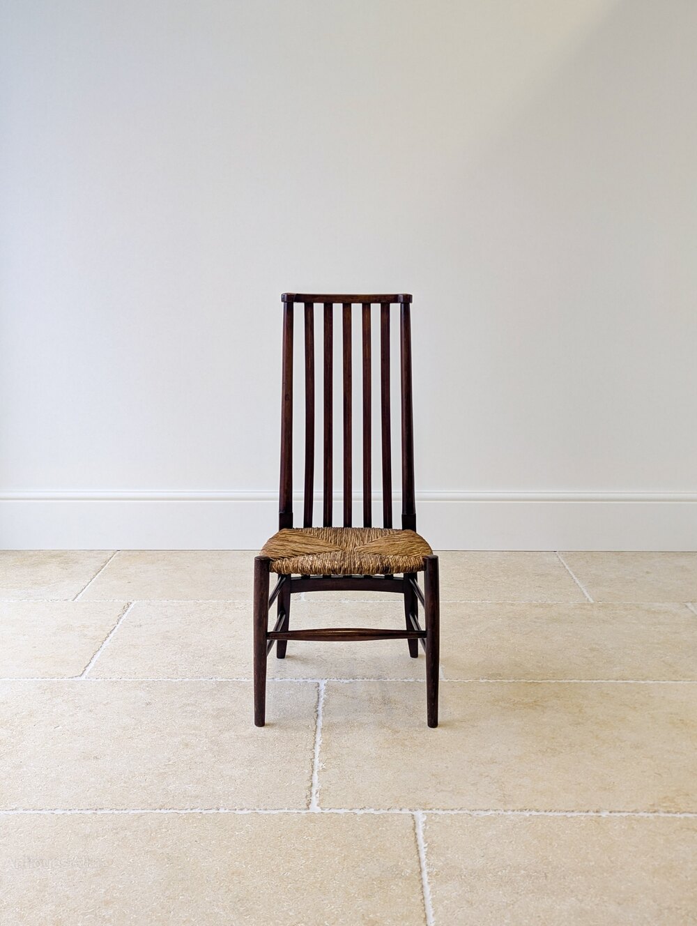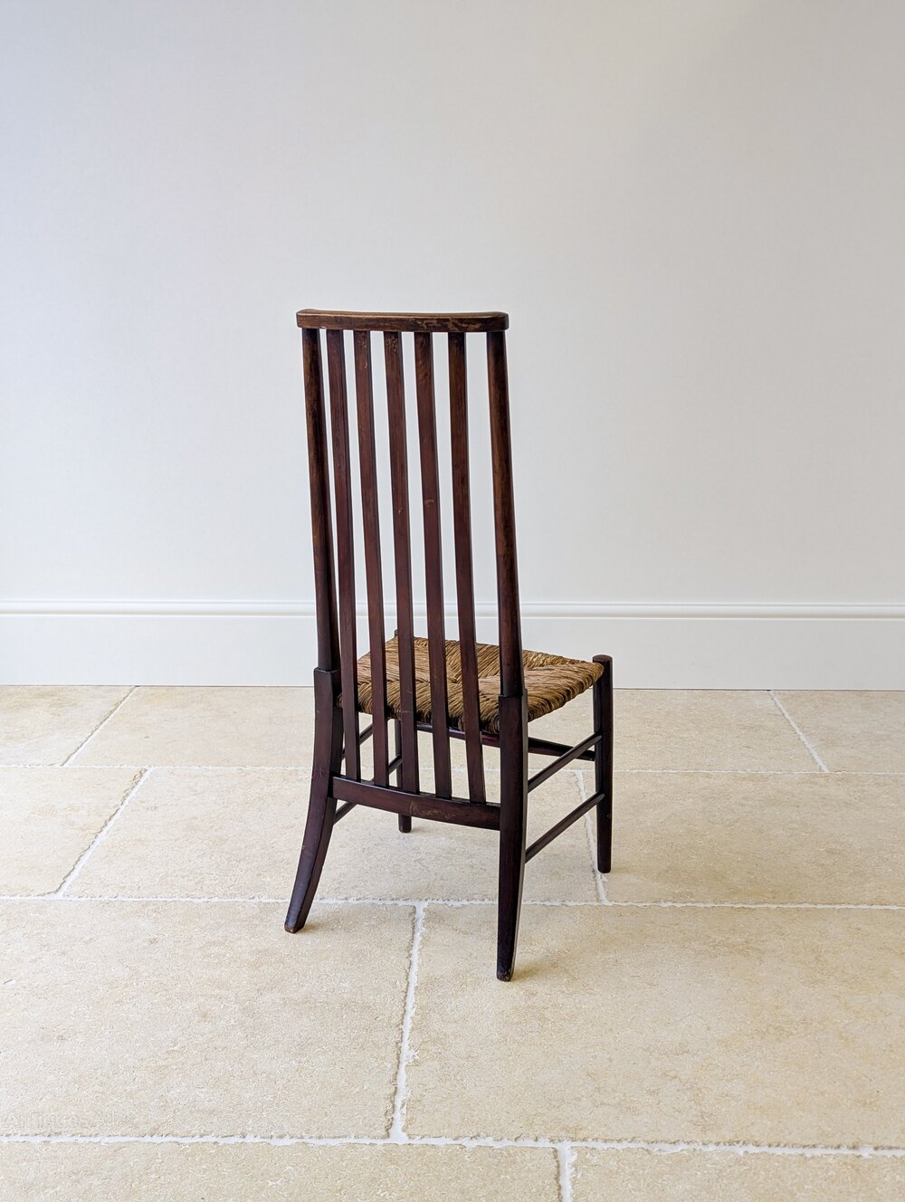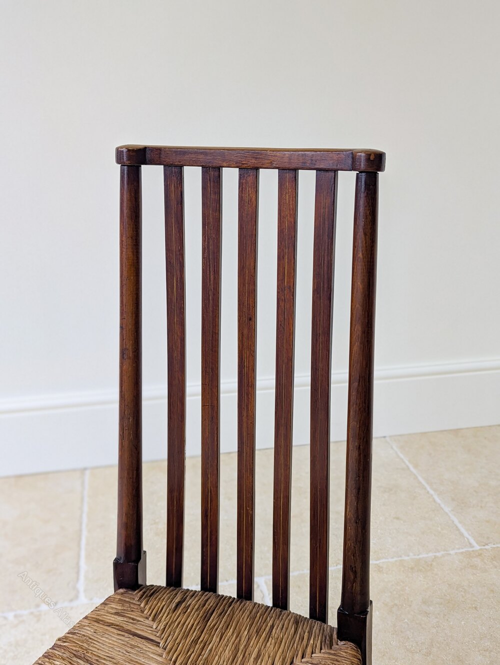 An Arts & Crafts occasional chair crafted in mahogany of particularly pleasing form. The tall back is formed with vertical slats detailed with subtle string inlay and running down below the rush seat, all raised on turned legs and a simple stretcher base.Very good antique condition with light surface wear consistent with age. The rush seat is tight, firm and in good order. Structurally sound, clean and ready to place.