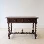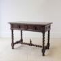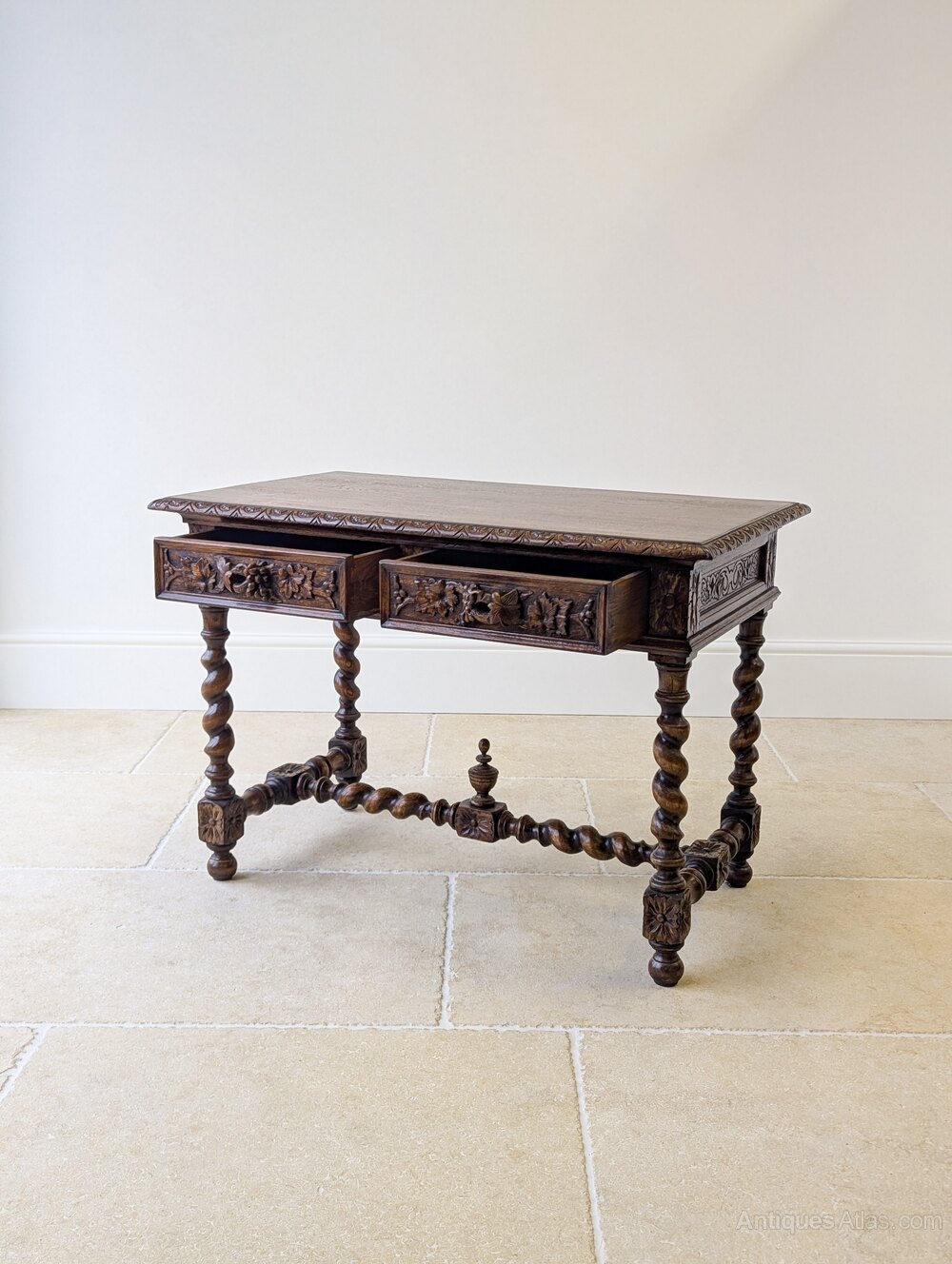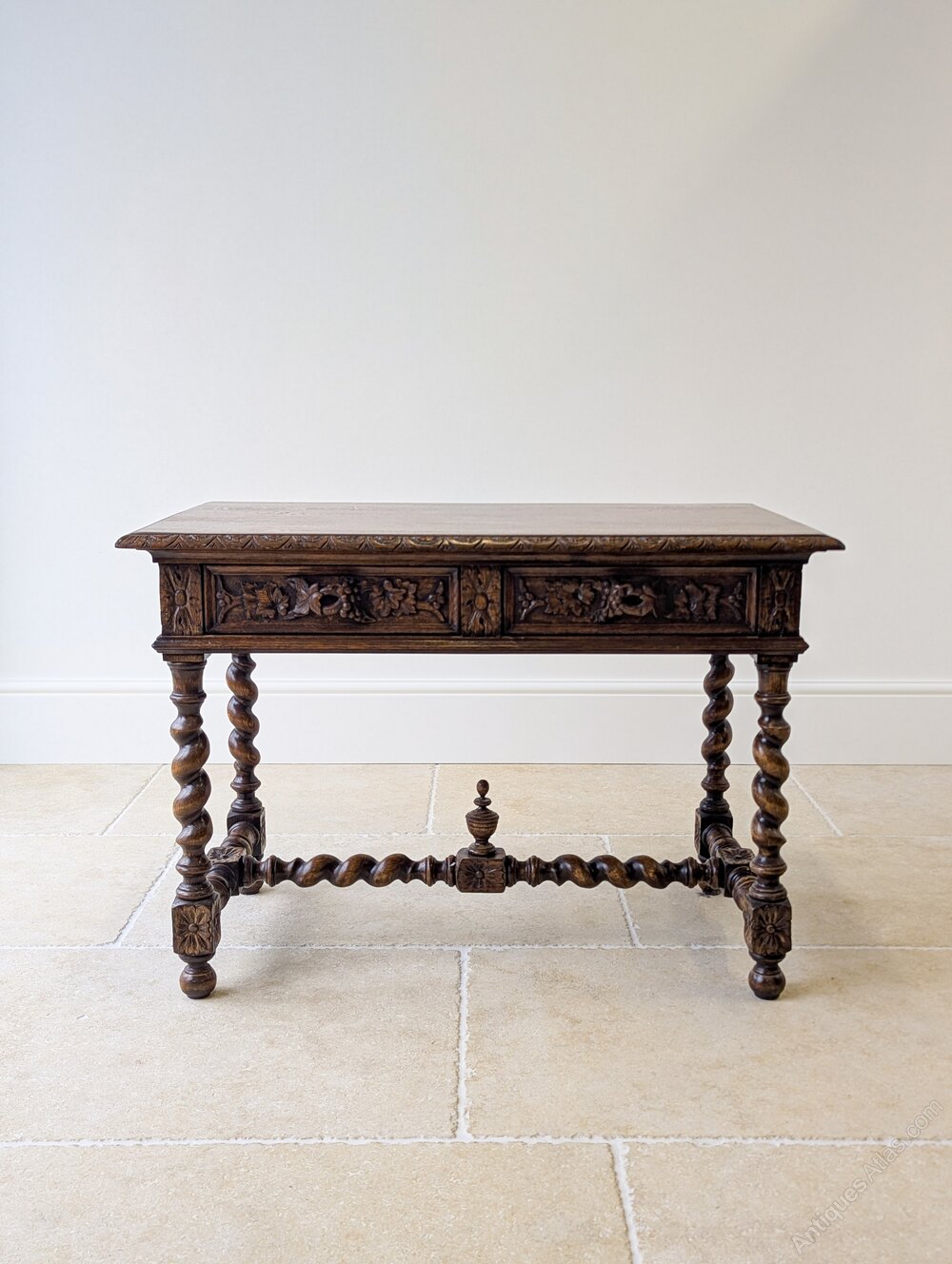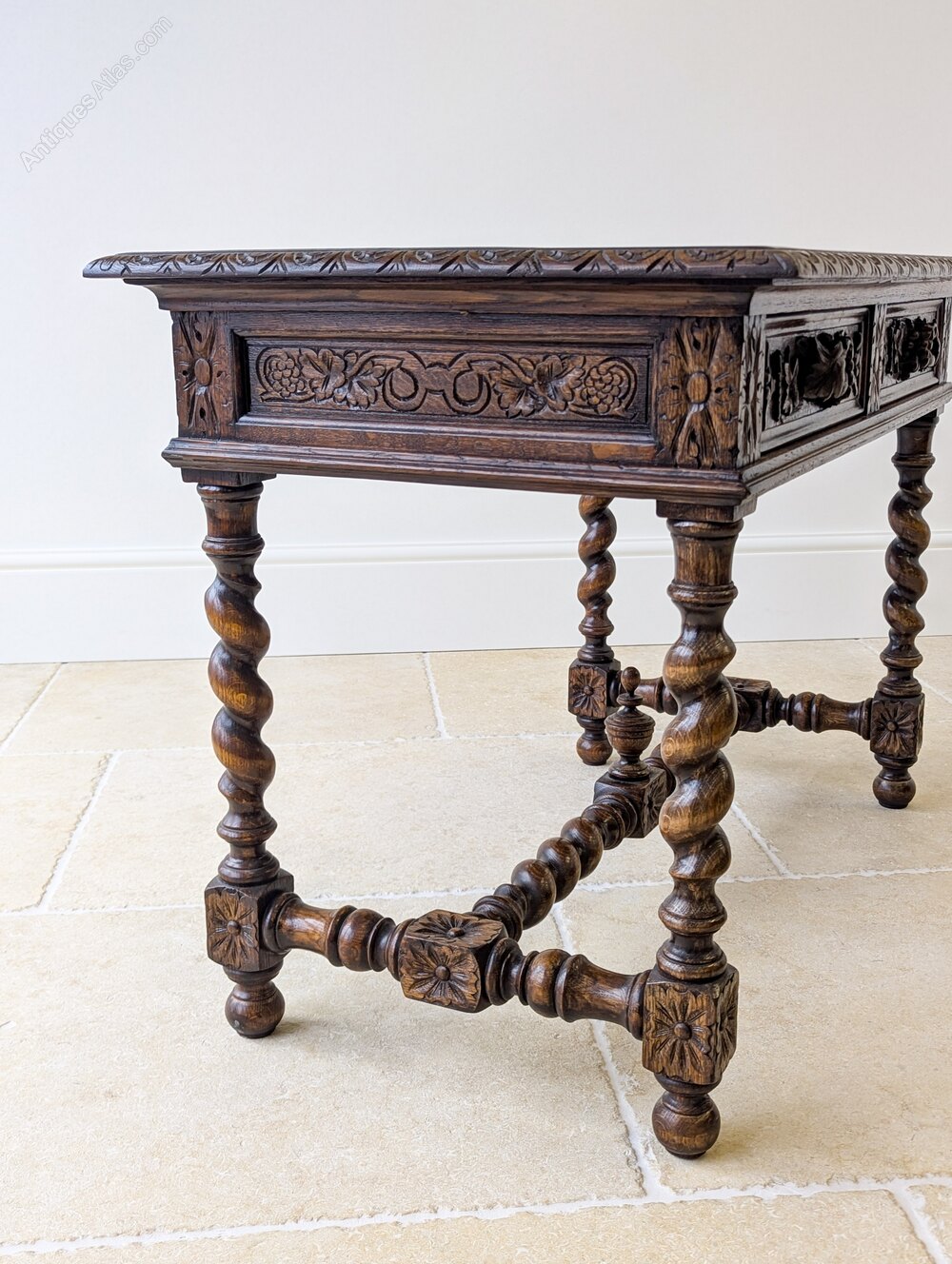 An impressive late Victorian richly carved oak library table of good scale. The rectangular top with carved border sits above an extensively carved frieze with two drawers, all raised on barley twist legs united by a turned stretcher base with central finial.A particularly decorative piece, in the Jacobean Revival taste, it would serve well as a writing table or as a console in a hall or living space, but also suitable for central placement being fully finished and carved on all sides.