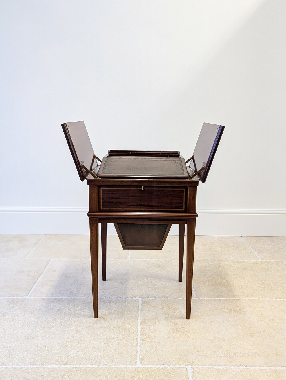 A compact Edwardian mahogany writing table with satinwood crossbanding and boxwood stringing, the top opening to reveal a smoothly rising writing slope, lifted automatically into place by the patented metamorphic action as the leaves are raised.The leather writing slope further lifts to reveal a spacious storage area beneath, with additional compartmentalised storage to the rear.