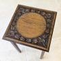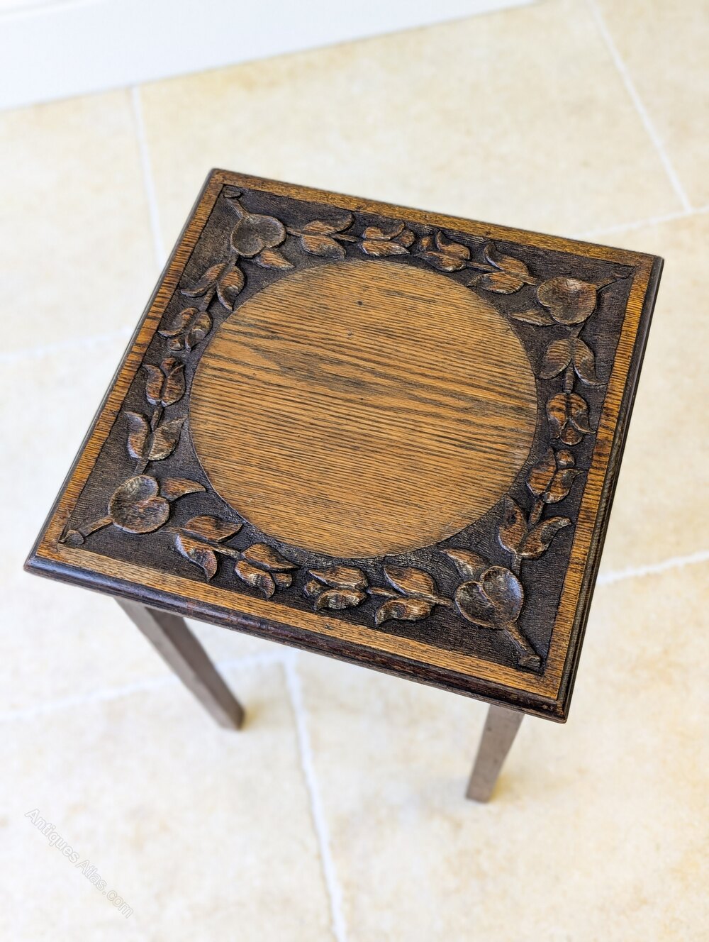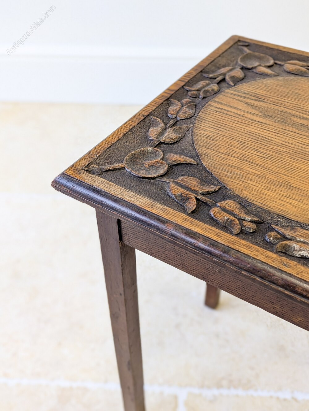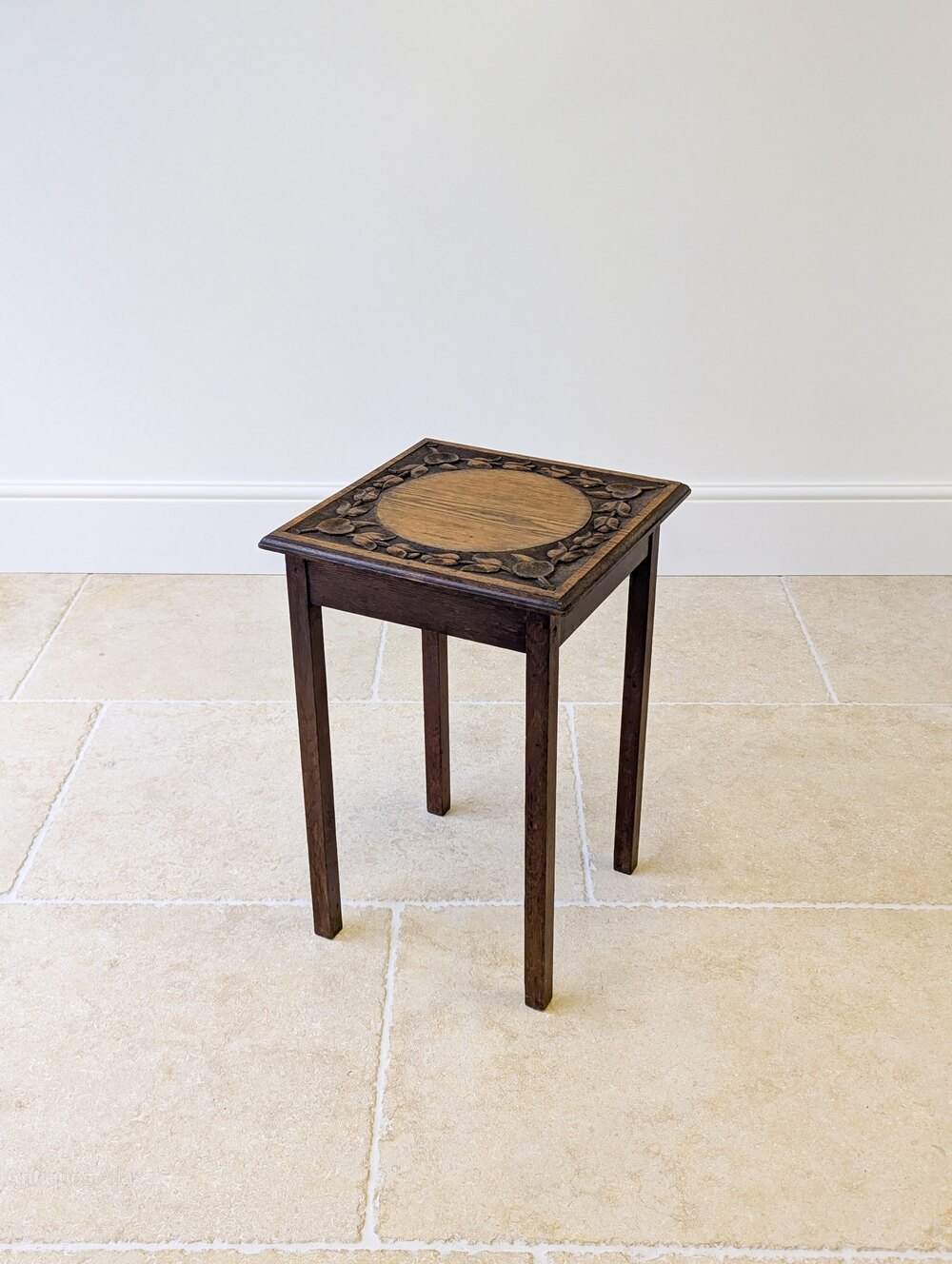 A small early 20th century oak occasional table in the Arts & Crafts taste, the square top framed with deep foliate relief carving against a darker recessed ground, centred by a plain circular reserve, over a simple base of slender square legs and a plain apron.Very good antique condition with light surface wear and patina consistent with age. Structurally sound, clean and ready to place.