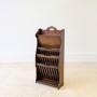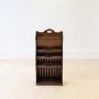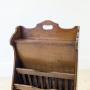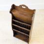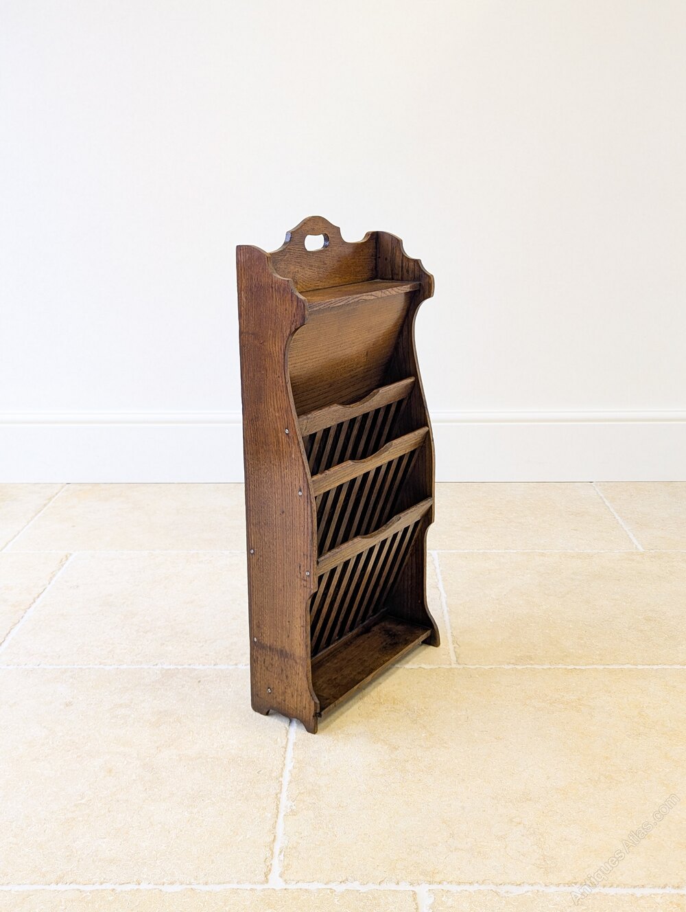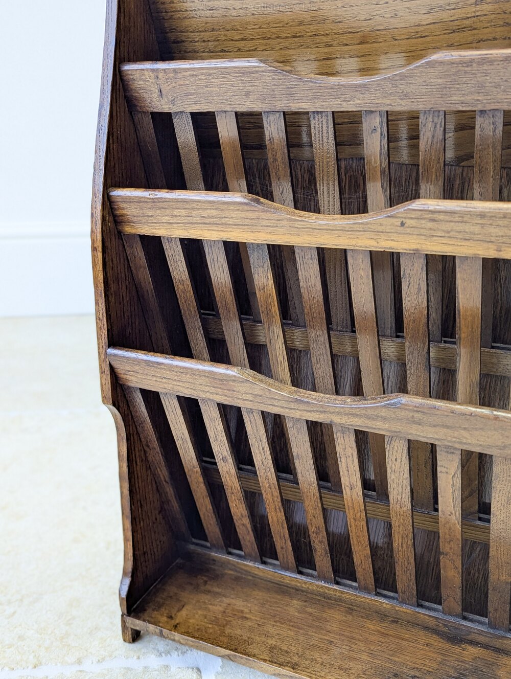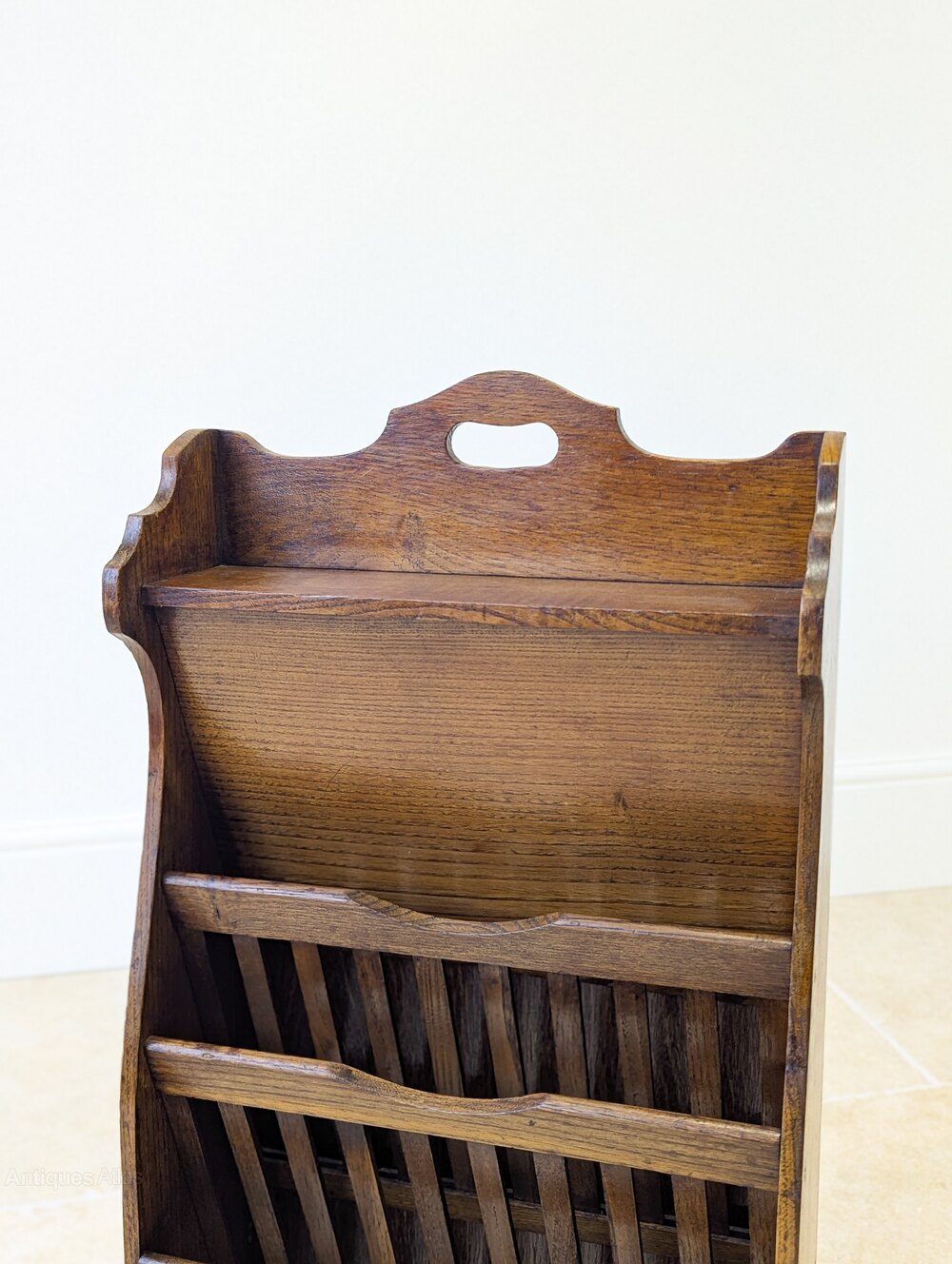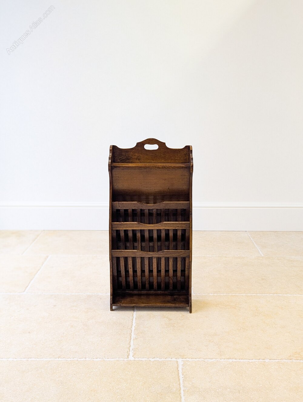An early 20th century oak floor-standing magazine and newspaper rack, the upper section formed with an open shelf and integral carry handle, above a divided lower rack with angled slats and shaped retaining rails.Very good antique condition with light surface wear consistent with age. Structurally sound, clean and ready to place.