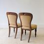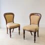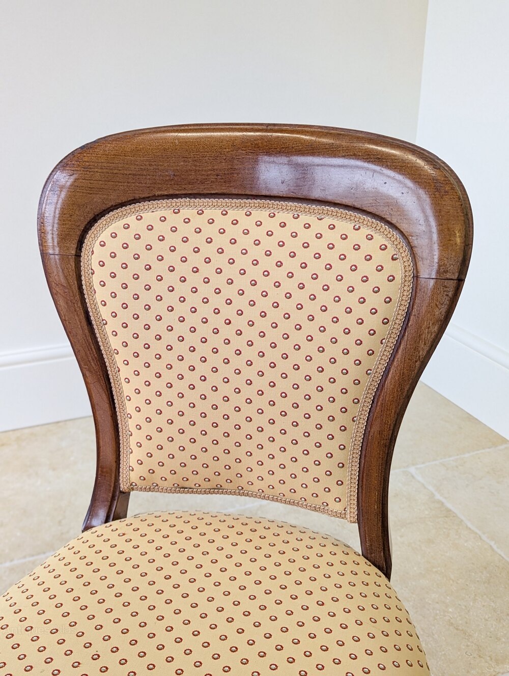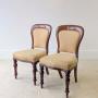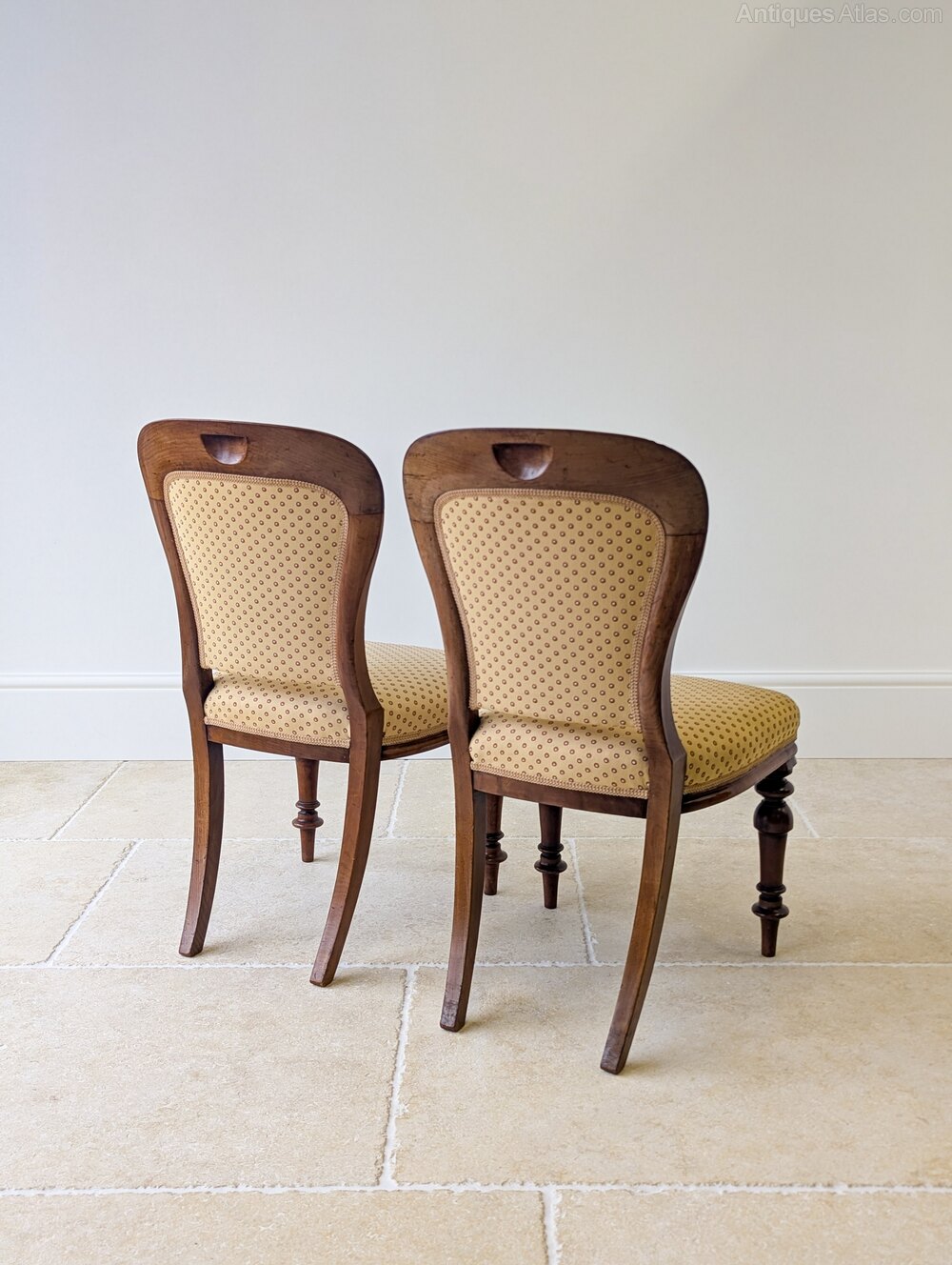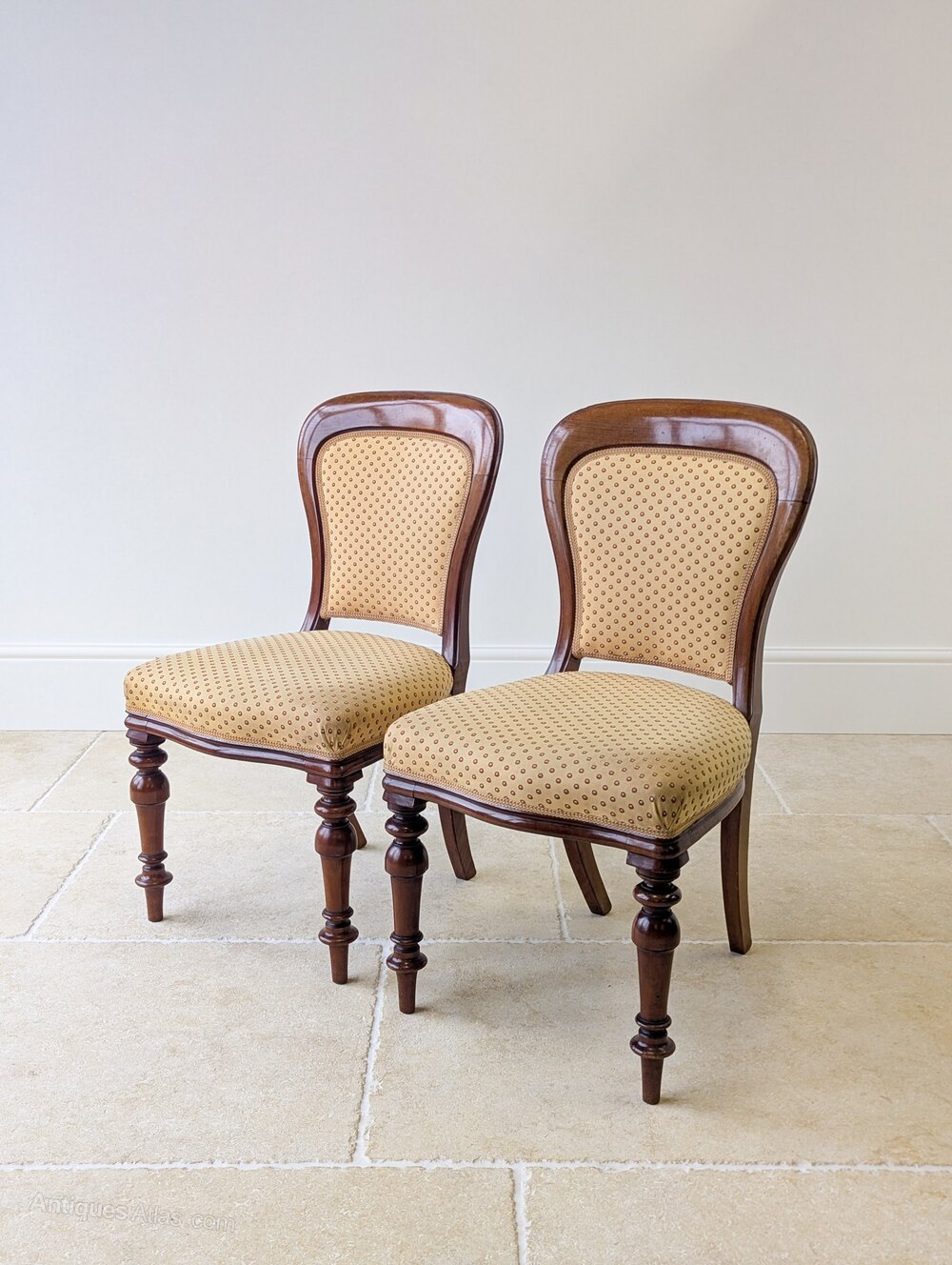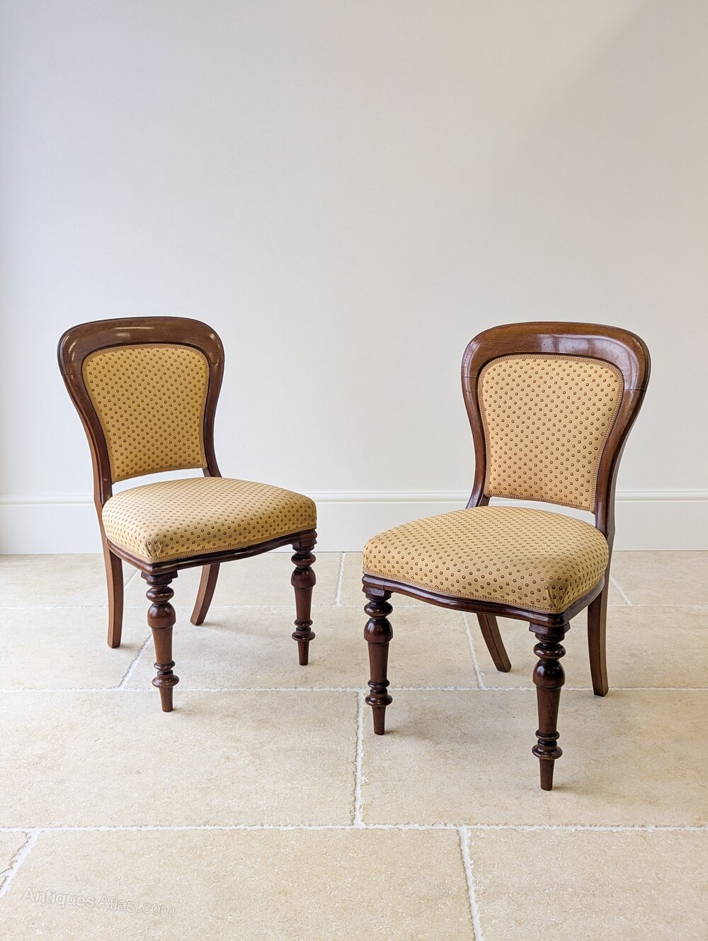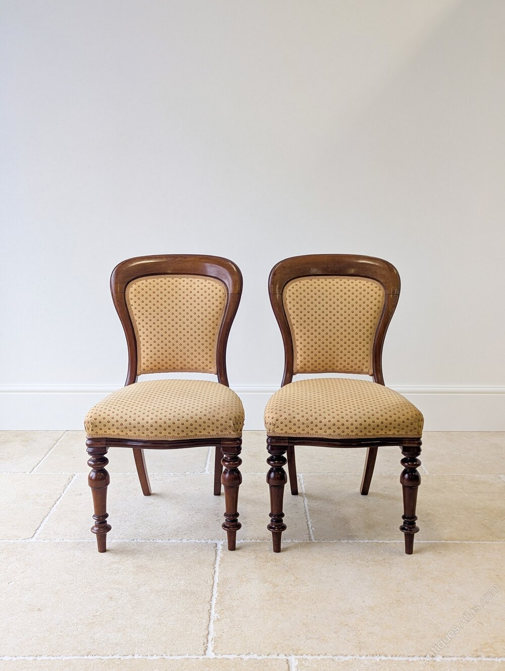 A good pair of Victorian walnut side chairs, with finely shaped upholstered backs framed by well figured frames over serpentine upholstered seats, all raised on baluster and ring turned front legs.Very good antique condition with light surface wear and patina consistent with age. The later upholstery is clean and serviceable, with some light marks consistent with use. Structurally sound, clean and ready to place.