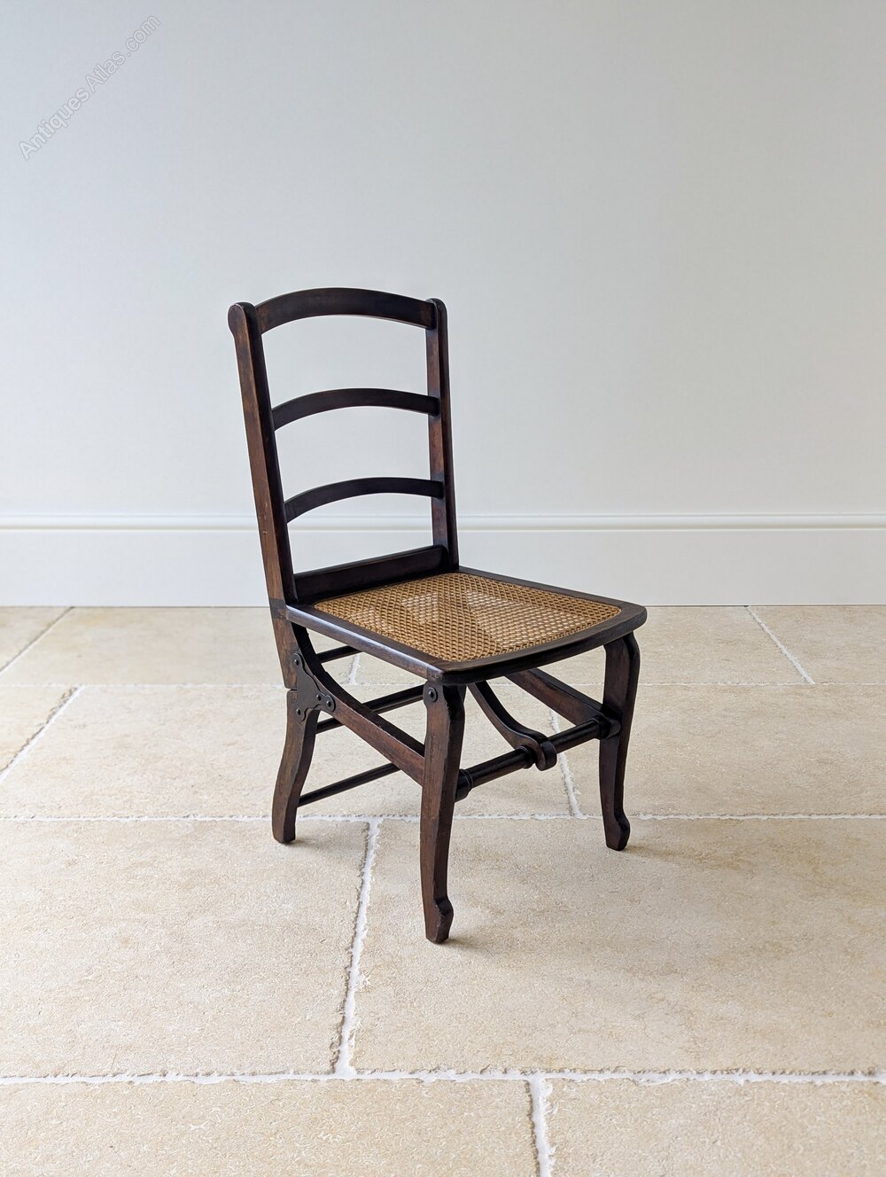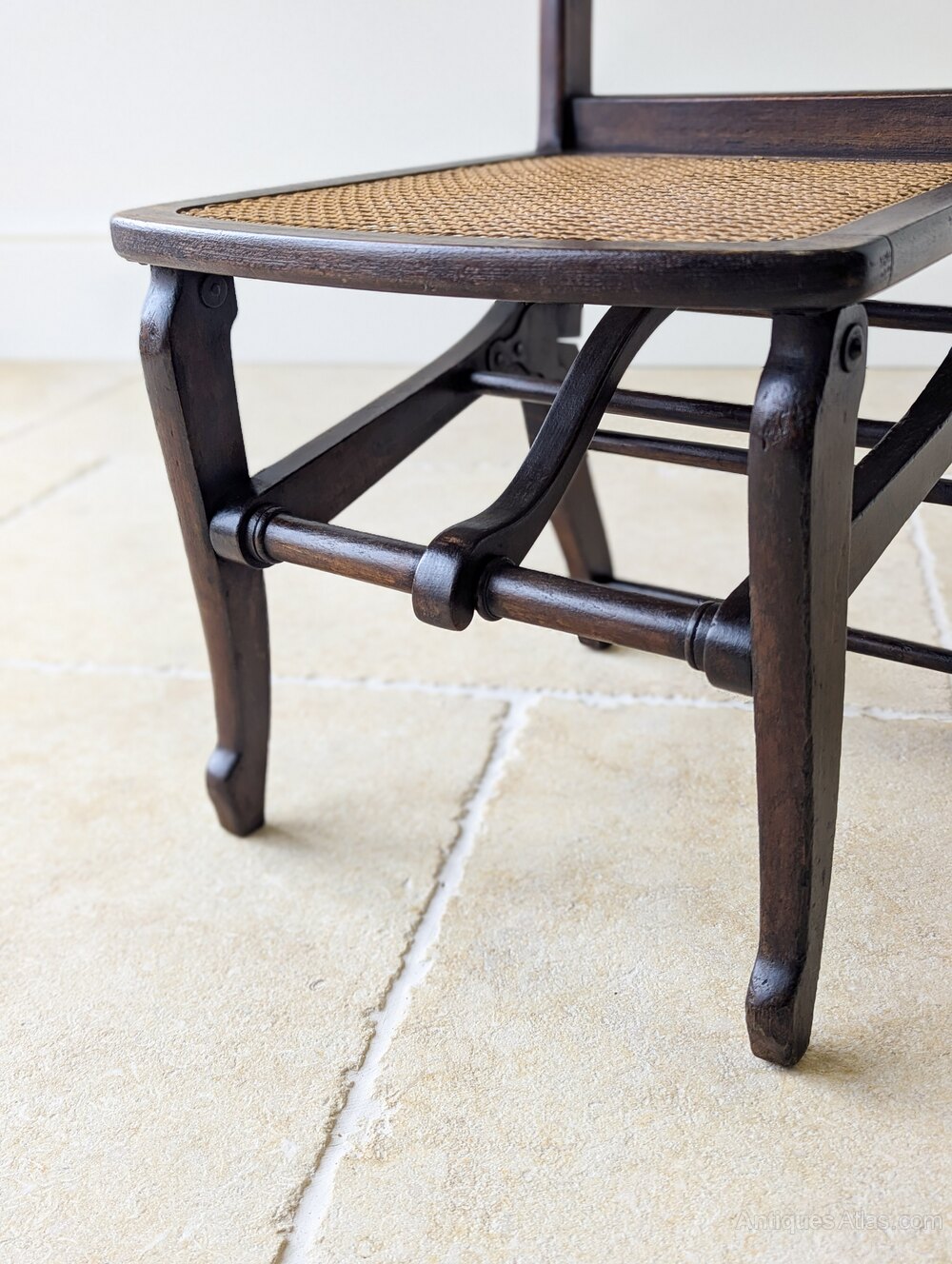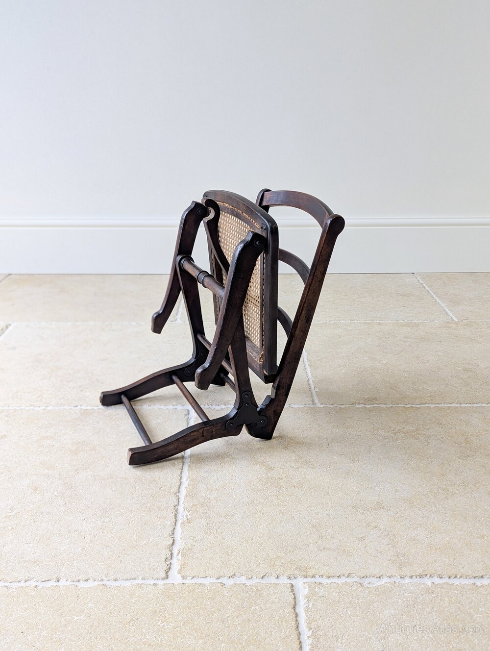 A Victorian folding campaign chair constructed in beech with a ladder back incorporating three shaped rails above a woven cane seat raised on slender shaped legs united by turned stretchers.The piece folds via an ingenious mechanism with shaped timber support arms and iron pivot plates, folding to an exceptionally compact size for storage and transit.