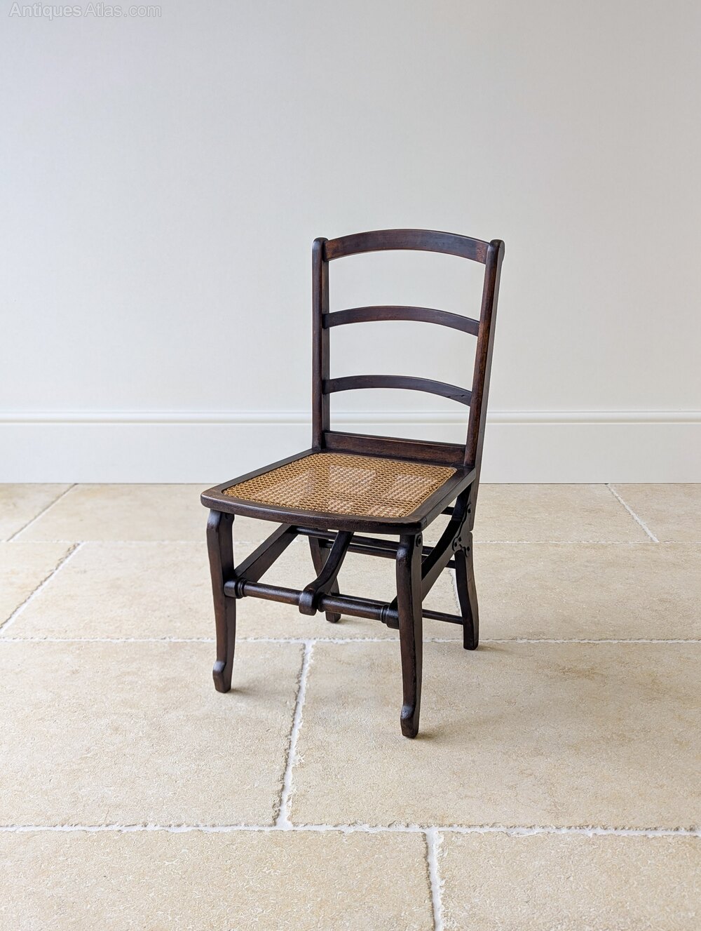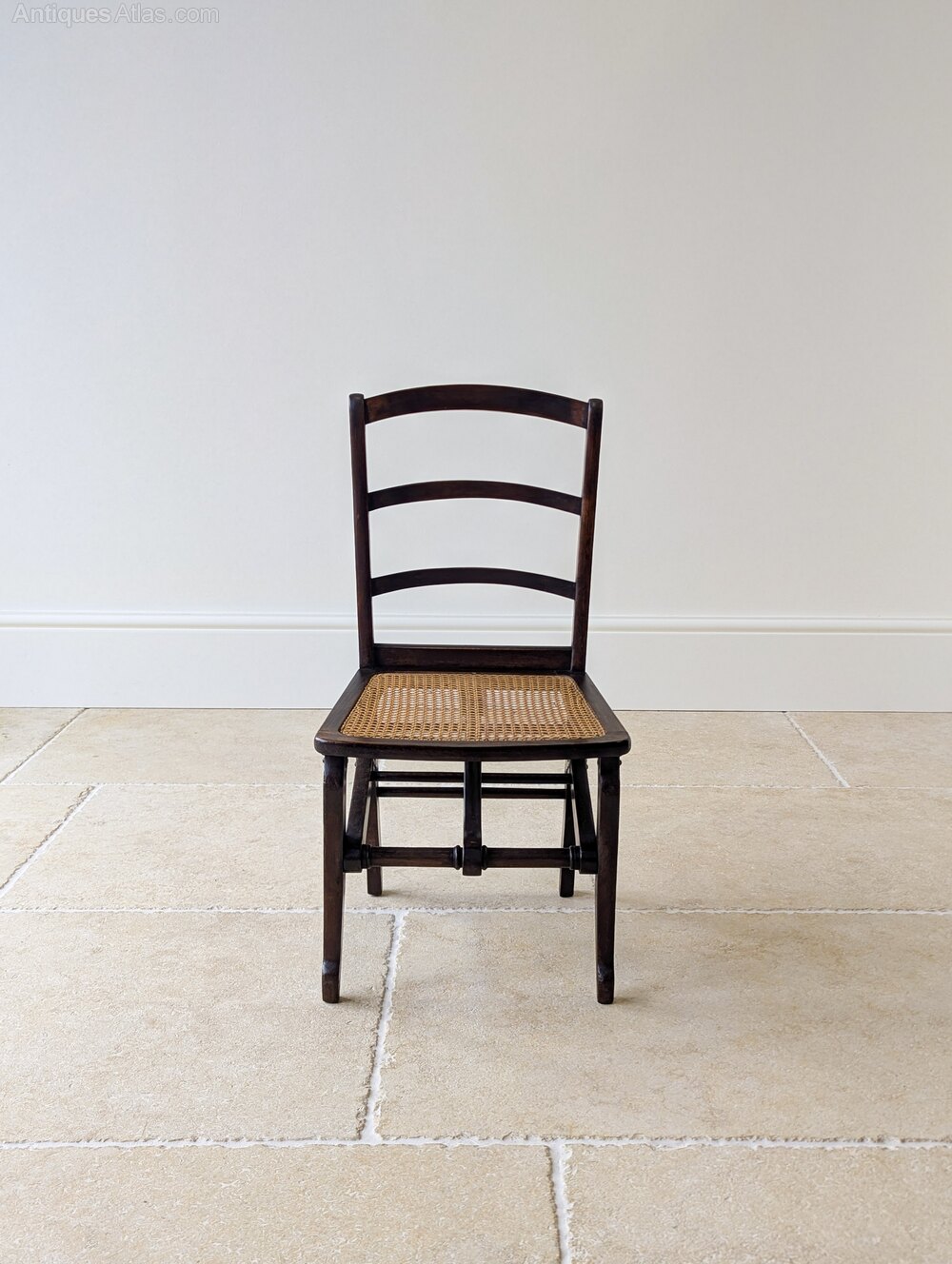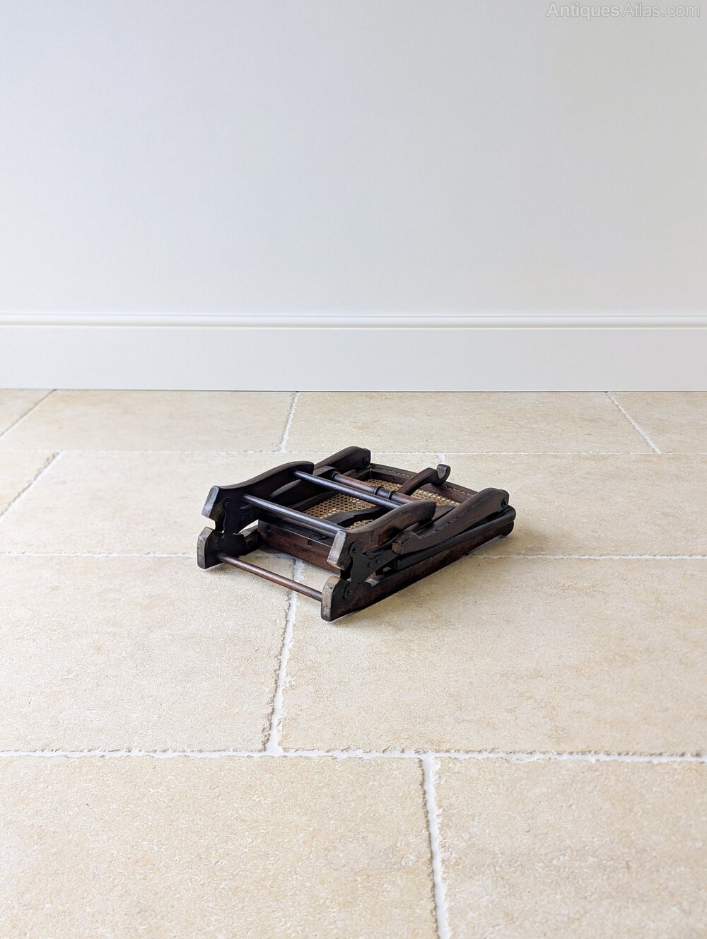 A Victorian folding campaign chair constructed in beech with a ladder back incorporating three shaped rails above a woven cane seat raised on slender shaped legs united by turned stretchers.The piece folds via an ingenious mechanism with shaped timber support arms and iron pivot plates, folding to an exceptionally compact size for storage and transit.