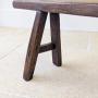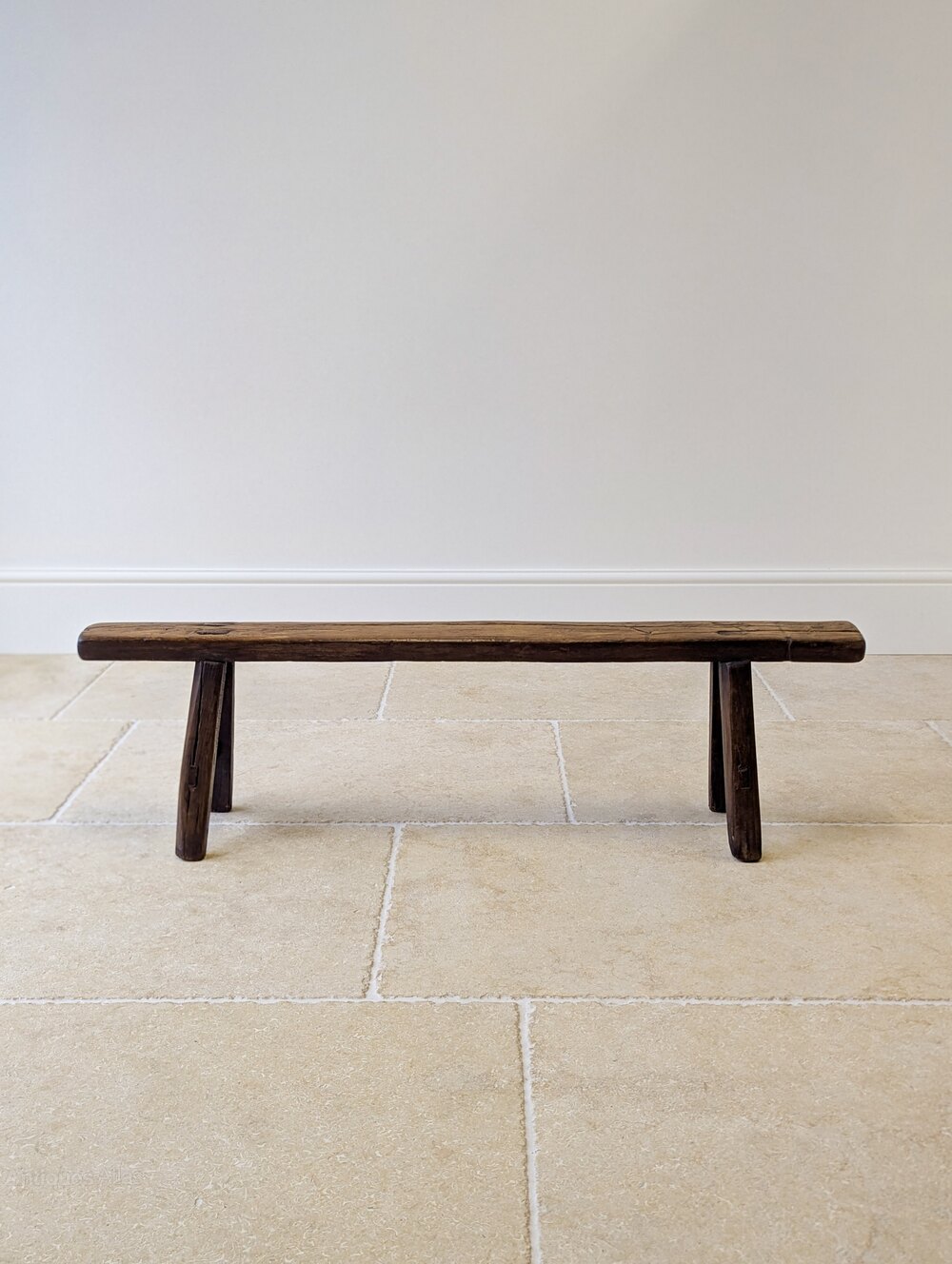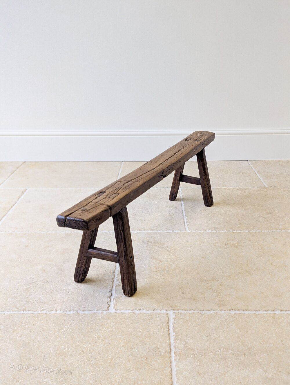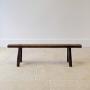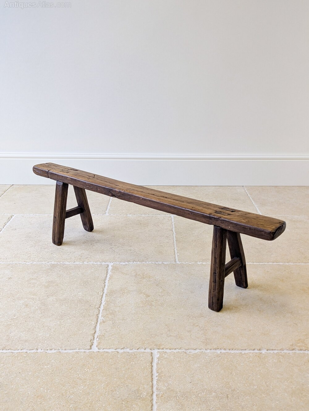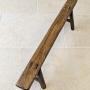 A characterful mid 19th century country-made bench constructed in elm, the long narrow single-plank seat set over splayed legs united by stretchers. Lots of natural shrinkage splits, visible wedged through-tenons and hand-worked shaping, all consistent with honest vernacular workmanship.The narrow proportions and low seating position make it particularly useful today as a hearth bench or hall perch.