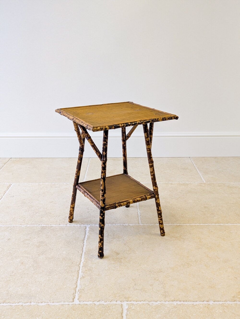 A late Victorian bamboo occasional table of square form, raised on gently splayed legs united by a lower tier and reinforced with typical decorative braces below the tabletop. A good original example with a warm, natural colour and reflecting the Anglo-Japanese influence that shaped the Aesthetic Movement in the closing years of the 19th century.Very good antique condition with only some minor surface wear consistent with age and use. Structurally all in good order, clean and ready to place in the home.
