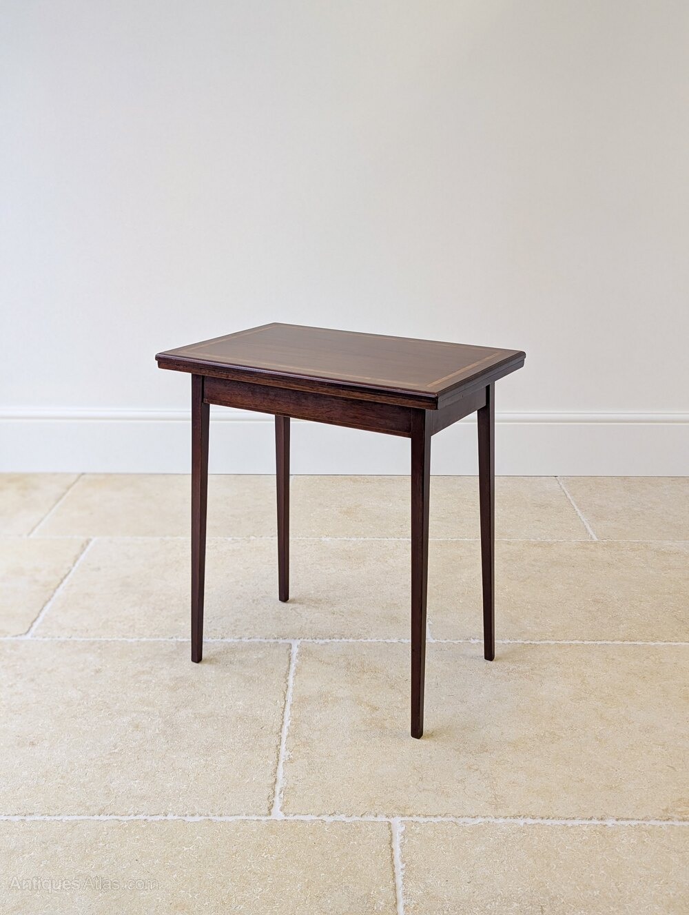 An Edwardian mahogany card table, the well-figured and finely crossbanded, line inlaid top swivelling and opening to a green baize playing surface, set over an inlaid apron and raised on slender splayed tapering legs.A particularly light and elegant example, with a conveniently modest footprint when closed yet opening to a generous playing surface.