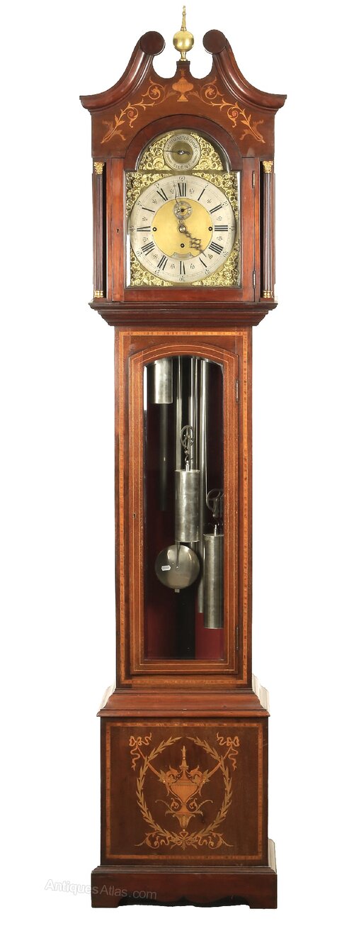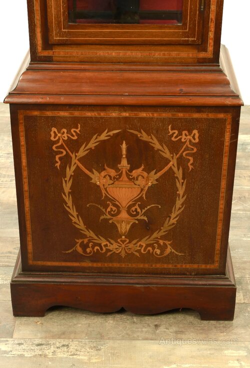 A good example of an Edwardian marquetry inlaid mahogany long case clock. The movement of 8-day duration, striking the hours and the quarters on tubular bells, which can be activated or silenced at will. This clock really is a statement piece and would certainly enhance the de or of a fine home.Frank Craig Antiques established 1972, with 50 years in the antique trade. Our experience ensures that we only select the best pieces in their category. We offer our customers a reliable service, with the assurance that all our stock is thoroughly vetted as genuine antique and sold at the best possible price point. All items are sold without restoration or a minimum if required and will be in a condition commensurate with age. We can arrange deliveries to any destination. If a purchase is returned for any reason, any incurred shipping charges will be the liability of the buyer. for further items of interest please visit our website