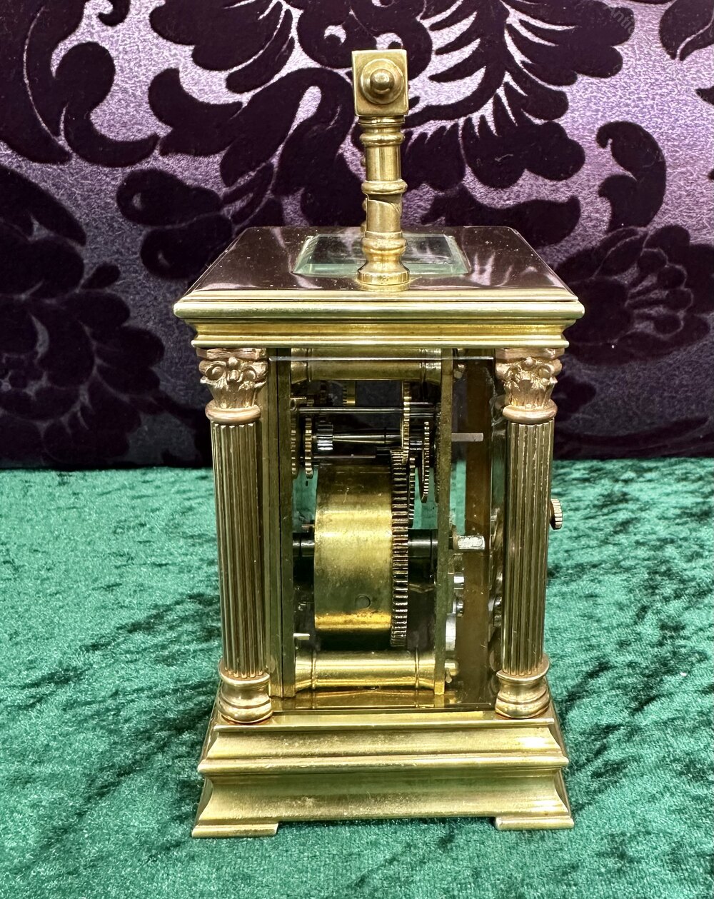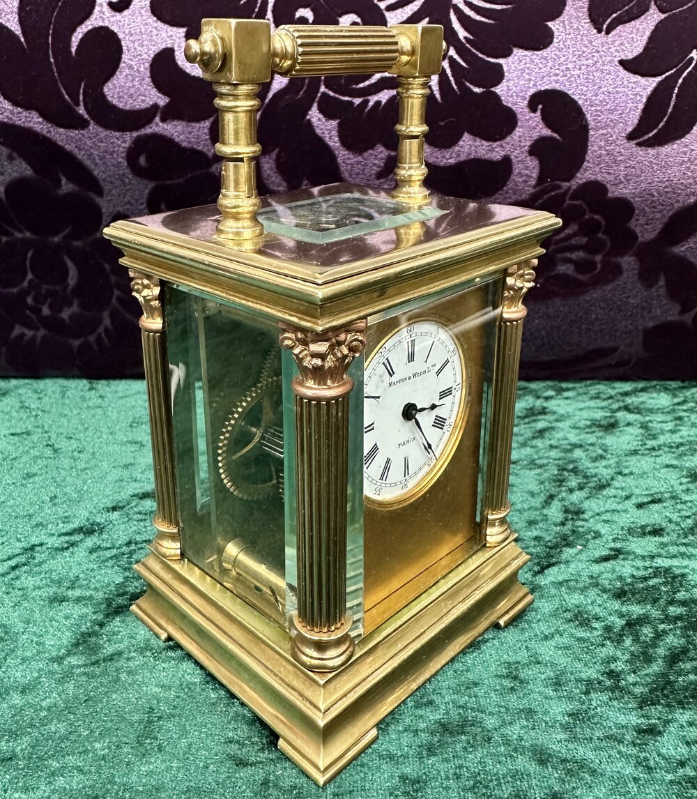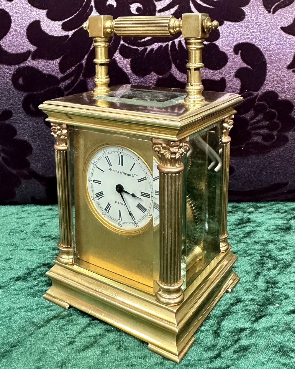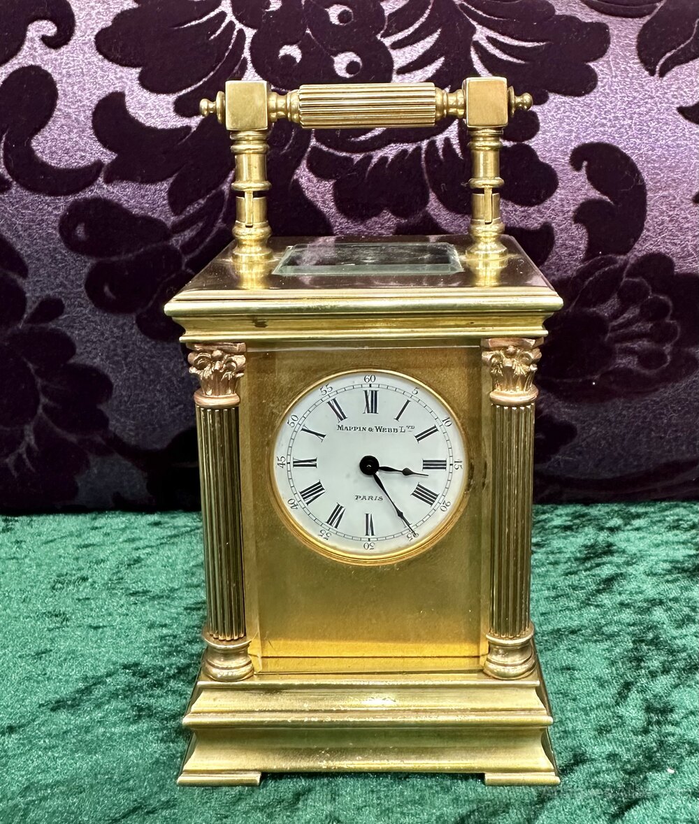 A really good carriage clock of eight day duration. As can be seen in the images a really solid piece with reeded Corinthian column supports. The measurements are with the handle up. The circular enamel dial with Roman and Arabic numerals and the renowned supplier Mappin and Webb.Frank Craig Antiques established 1972, with 50 years in the antique trade. Our experience ensures that we only select the best pieces in their category. We offer our customers a reliable service, with the assurance that all our stock is thoroughly vetted as genuine antique and sold at the best possible price point. All items are sold without restoration or a minimum if required and will be in a condition commensurate with age. We can arrange deliveries to any destination. If a purchase is returned for any reason, any incurred shipping charges will be the liability of the buyer. for further items of interest please visit our website