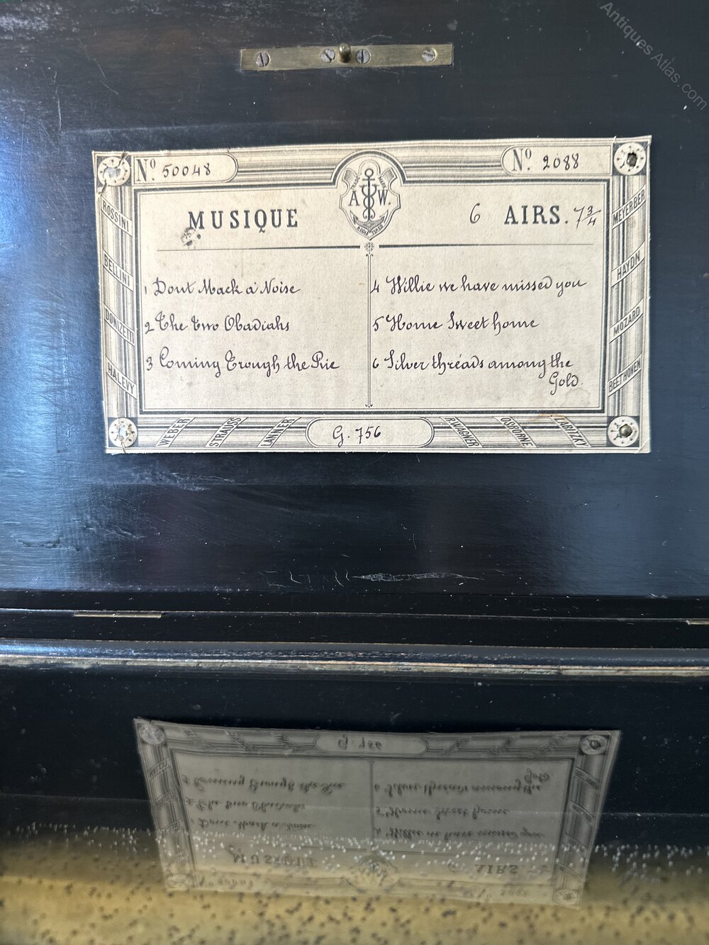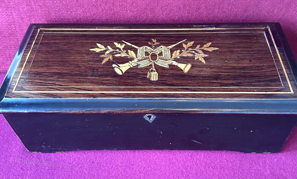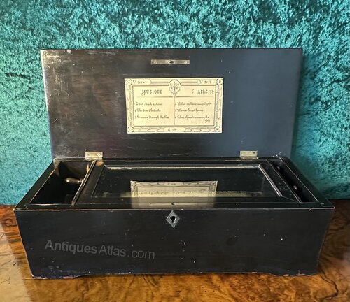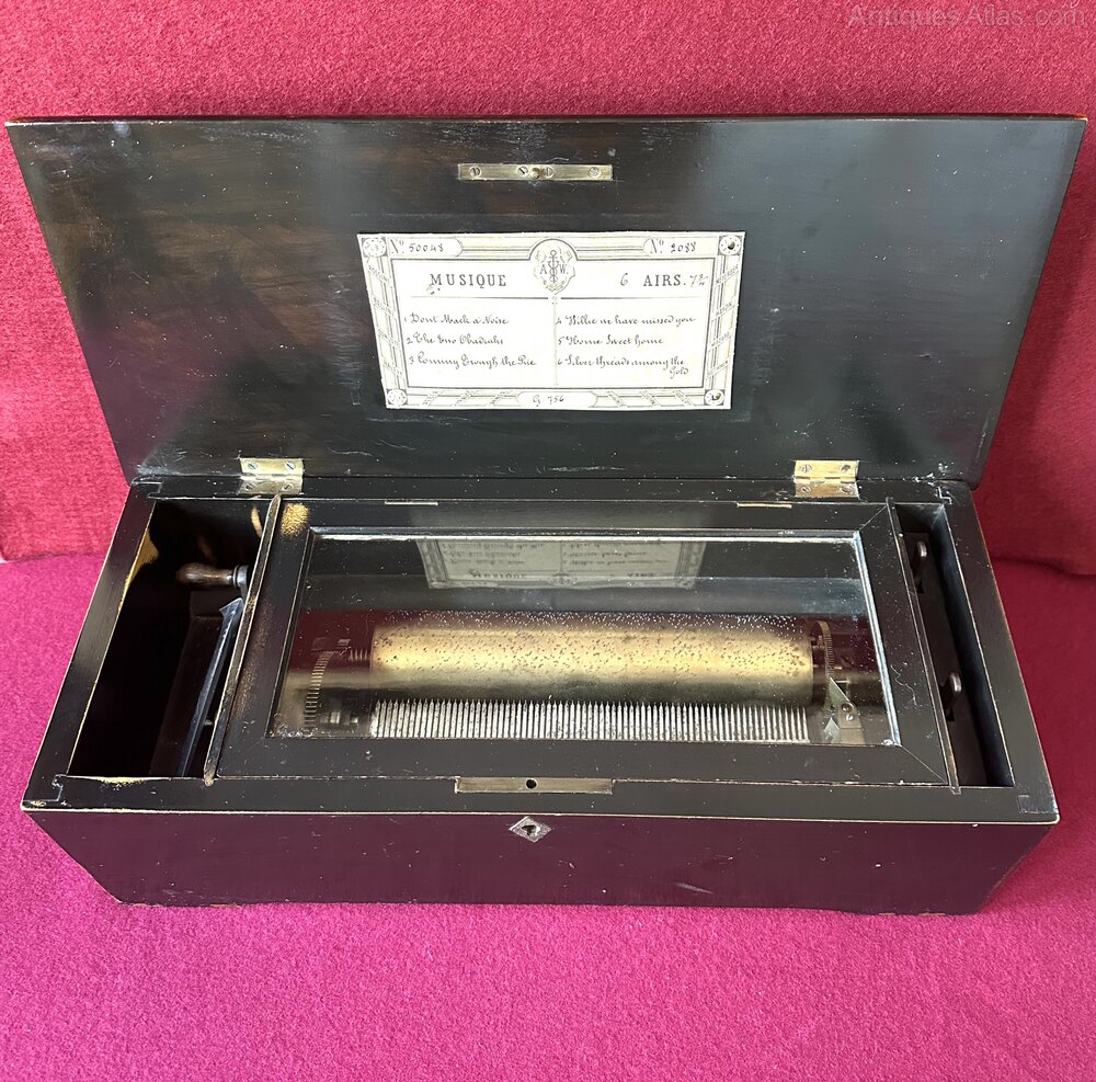 A good Victorian music box playing 6 pleasant airs, as shown on the tune sheet. The tunes can be played individually or continuously on a loop. Ht 13, W 43, D 19 cmsFrank Craig Antiques established 1972, with 50 years in the antique trade. Our experience ensures that we only select the best pieces in their category. We offer our customers a reliable service, with the assurance that all our stock is thoroughly vetted as genuine antique and sold at the best possible price point. All items are sold without restoration or a minimum if required and will be in a condition commensurate with age. We can arrange deliveries to any destination. If a purchase is returned for any reason, any incurred shipping charges will be the liability of the buyer. for further items of interest please visit our website