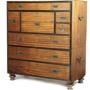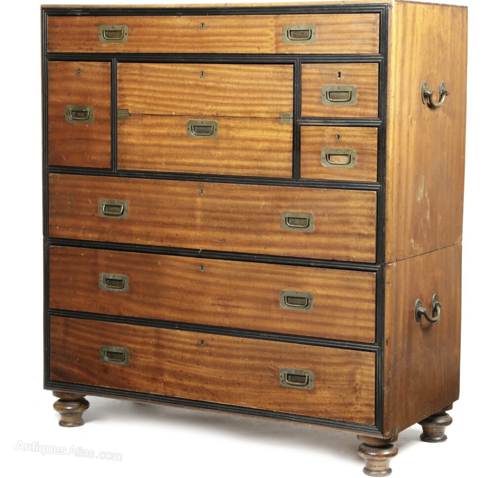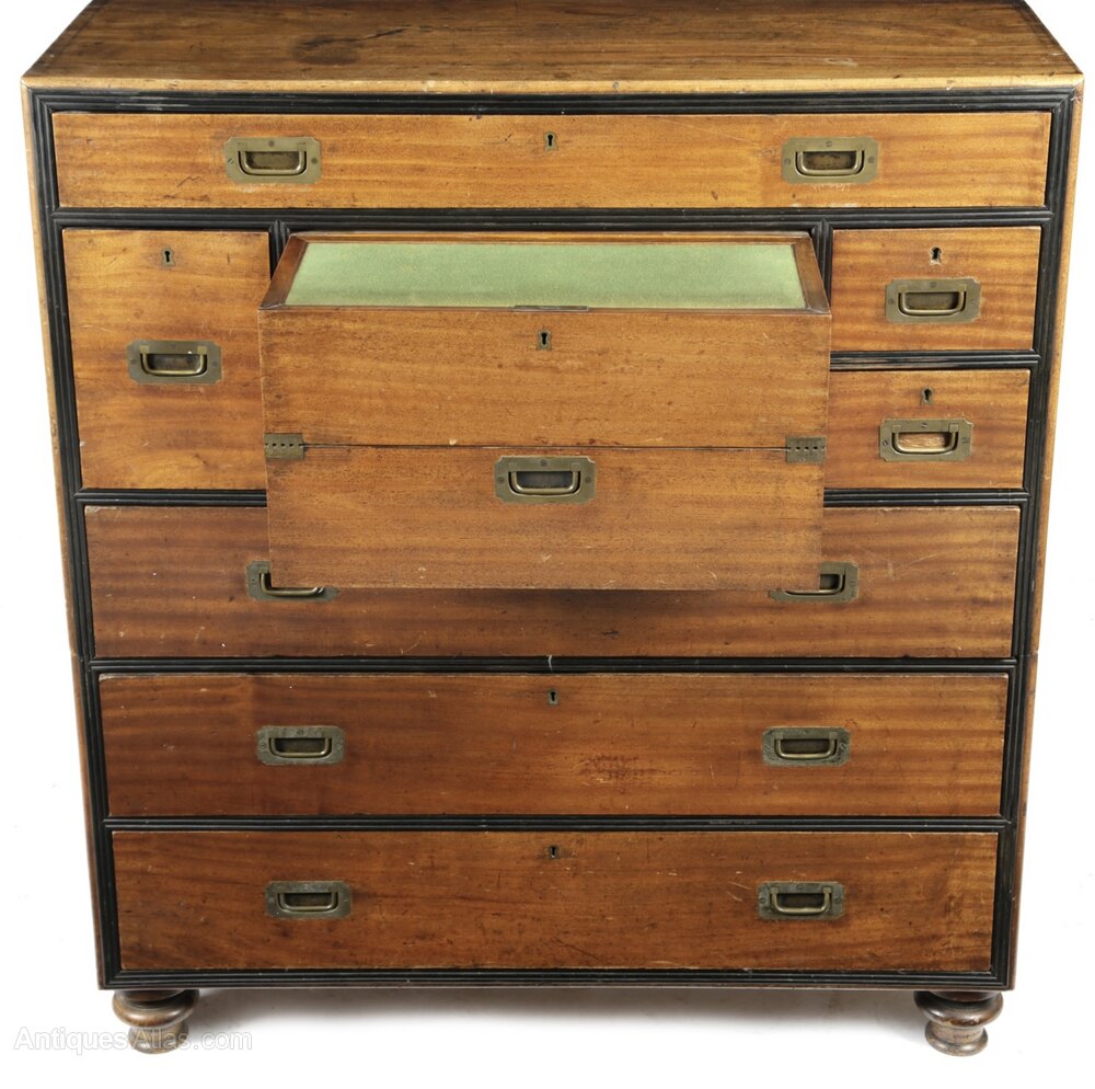 A superior campaign chest, which would have been made in China for a high ranking officer or colonial administrator in the late 19th century. This is an opportunity to buy a chest of this type at a reasonable price, as it comes in unrestored original condition straight from a property. When the drawers are opened , it still retains the original perfumed aroma of camphor wood.As can be seen in the illustration the central upper section has a pull-out Secretaire drawer, which folds over to form a writing surface, fitted with various compartments and pigeon holes. Further images are available upon request.