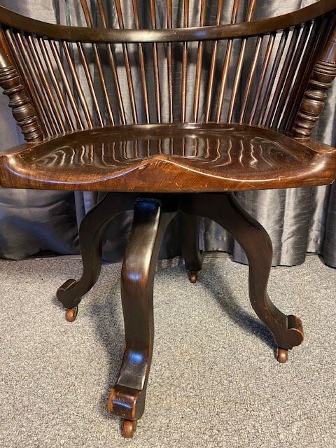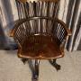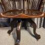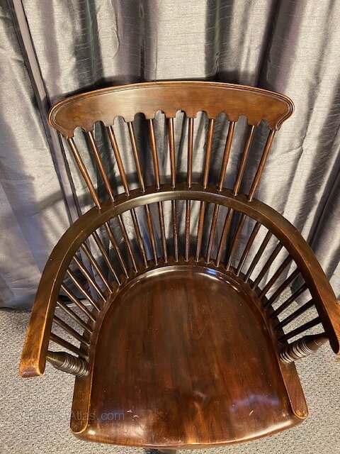 This wonderful mahogany revolving chair with saddle seat and spindles to the back and sides , supported by arched arms. The chair stand on cabriole style legs with castors. This chair would be ideal in an office, hallway or kitchen.Dimensions:-