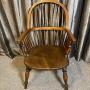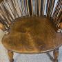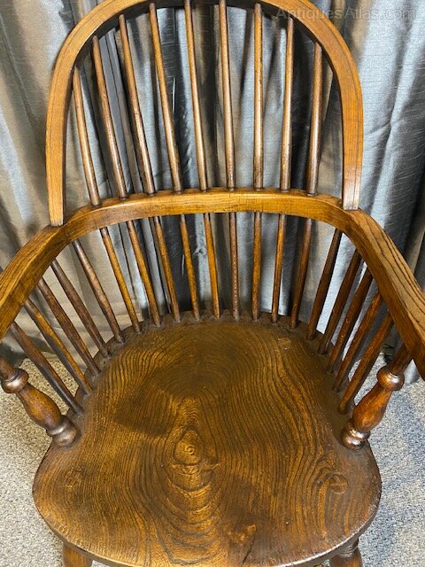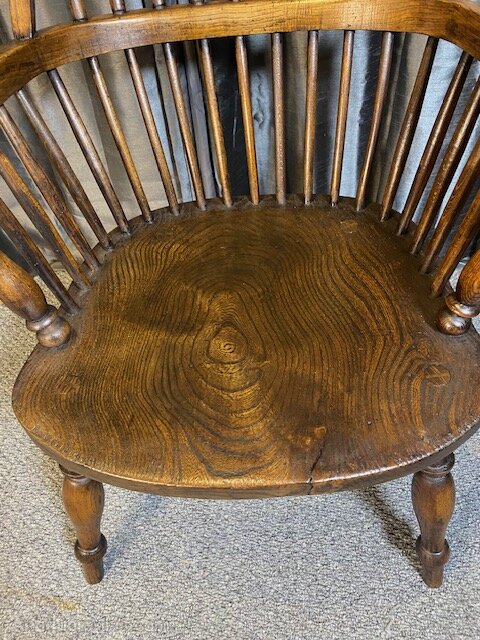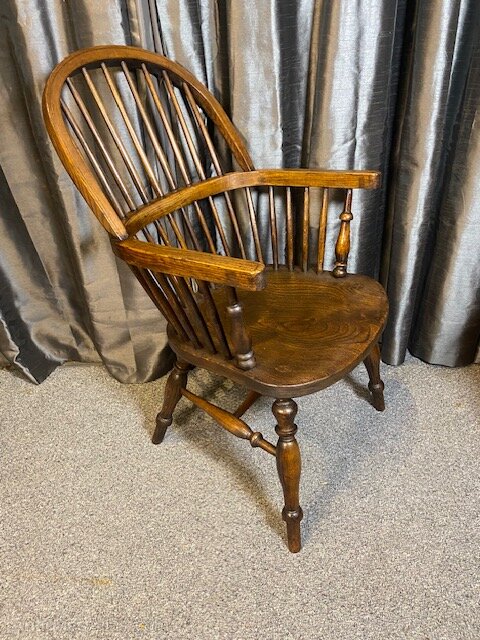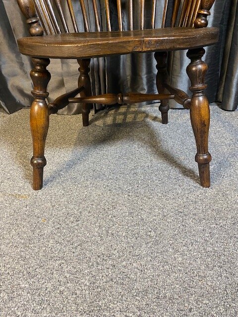 This Elm and Ash windsor chair which is dated and stamped BW High Wycombe 1906 would be ideal for a kitchen / hallway/ office or dining table. The chair has a shaped back and spindles for supports and with curved arms , standing on turned legs and side support bars.Dimensions:-
