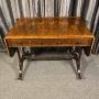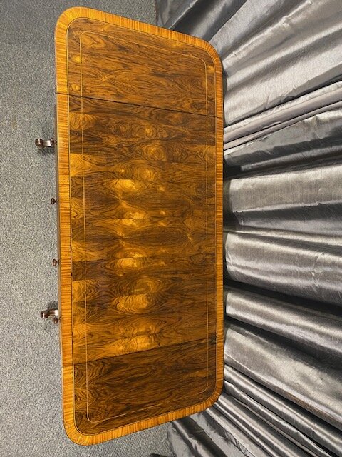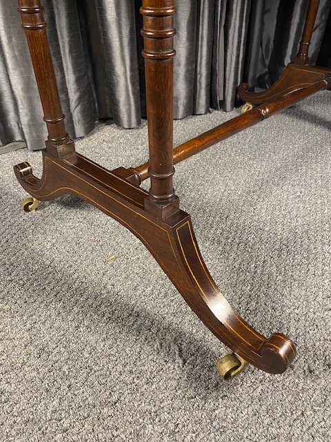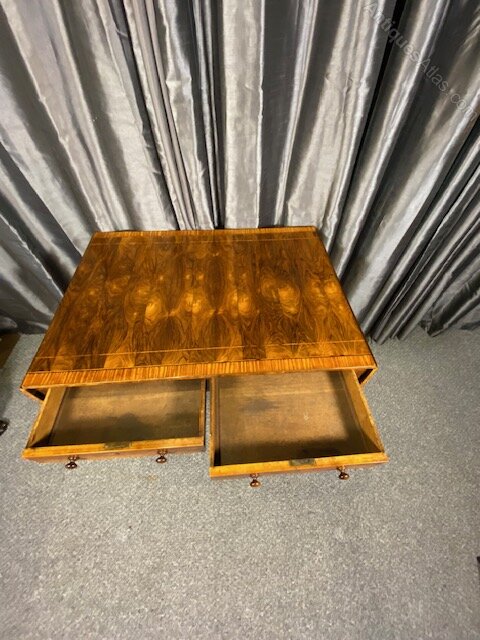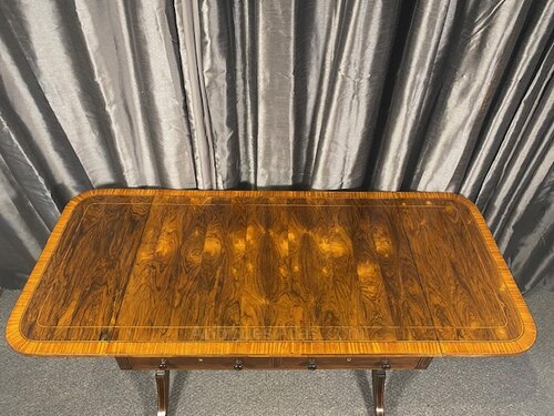 This elegant Rosewood sofa table which has a rich warm colour and well figured top showing its deep patina developed over generations with a satinwood, ebony and boxwood line inlays . The table is supported on splayed legs with brass castors allowing for ease of movement. This table would be ideal for behind a sofa , in a hallway or use as an occasional table. The table has two oak lined drawers so ideal for storing items .Dimensions:-