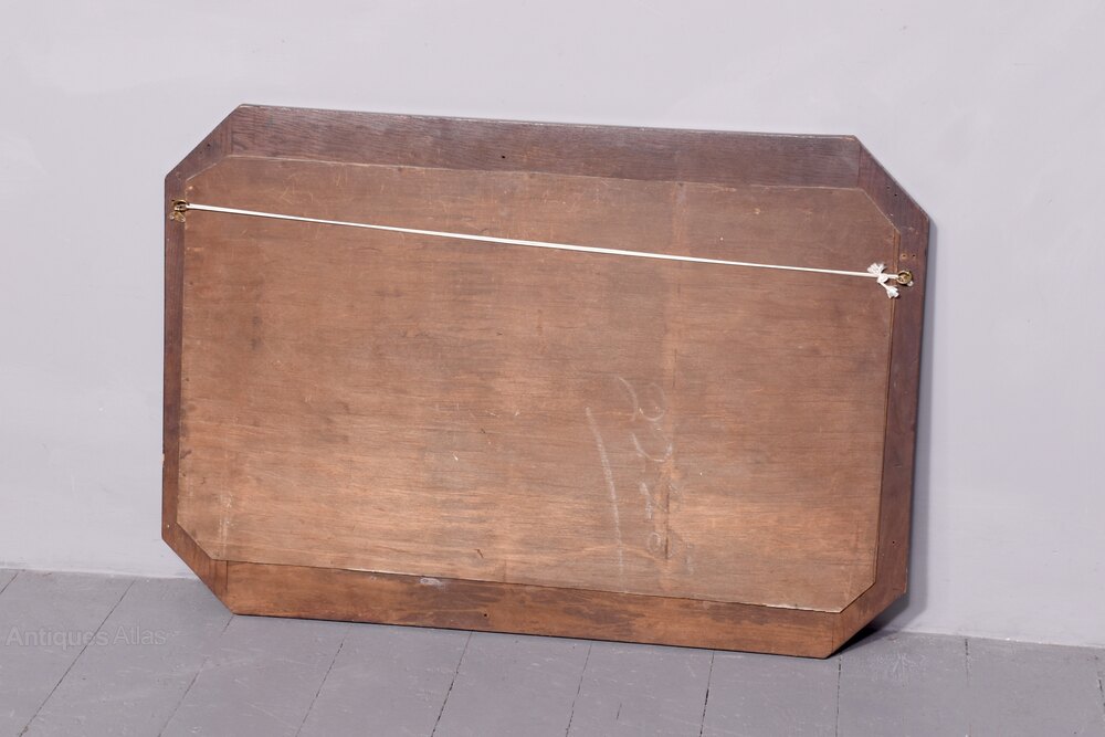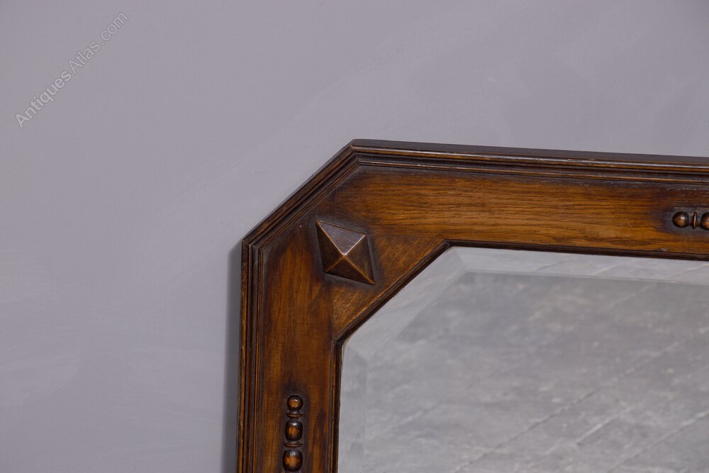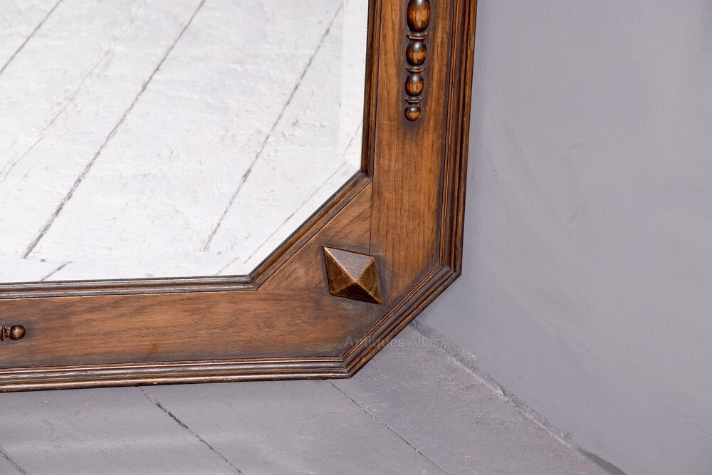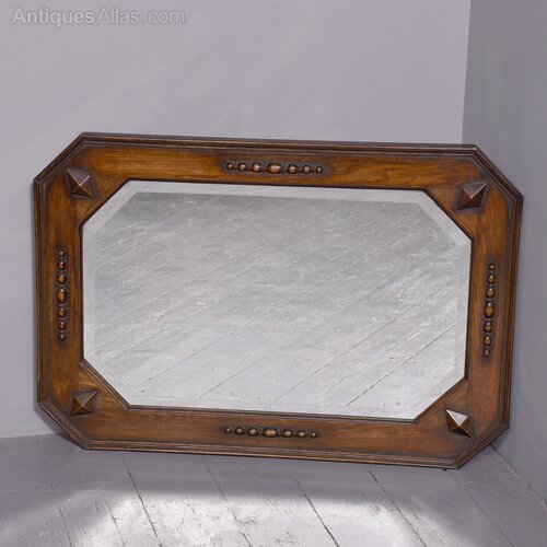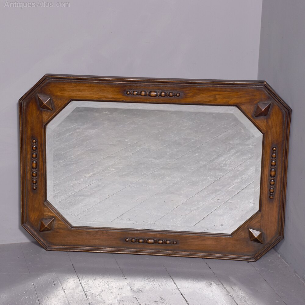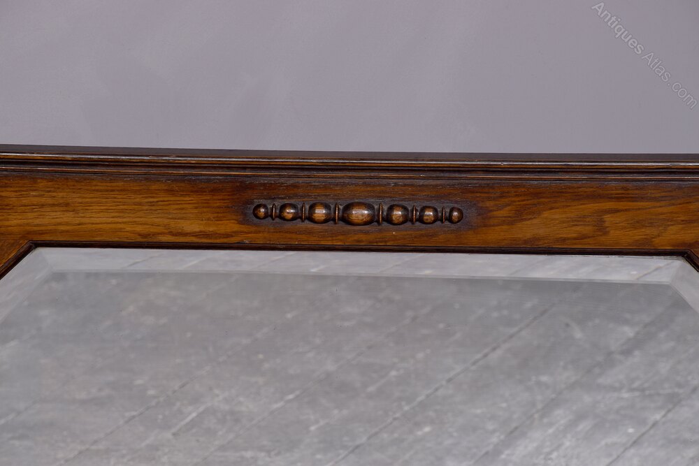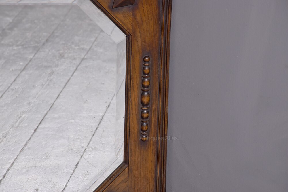 Circa 1920. Large oak Jacobean-revival bevelled edge rectangular wall mirror. The mirror frame with canted corners, beaded and diamond decorations and with a moulded edge surrounding the rectangular bevel edge mirror. Nice colour and patina and mirror in perfect condition.91cm Wide, 63cm High, 5cm Deep