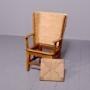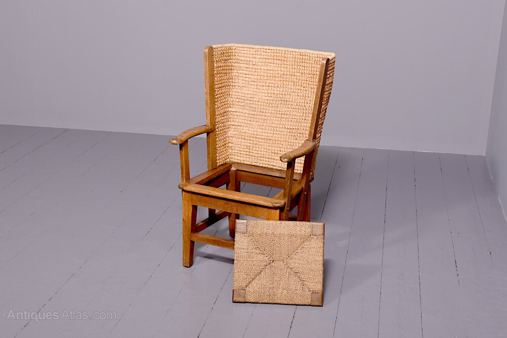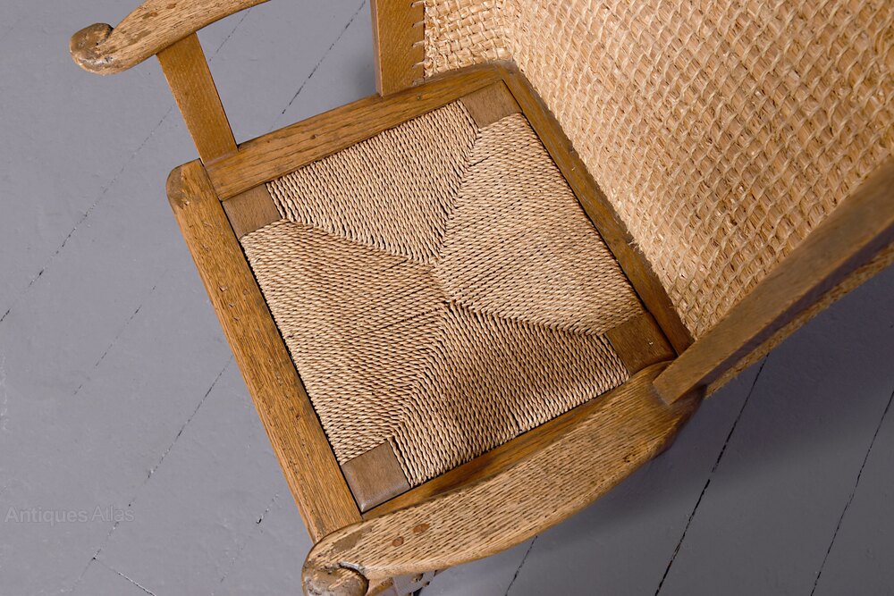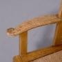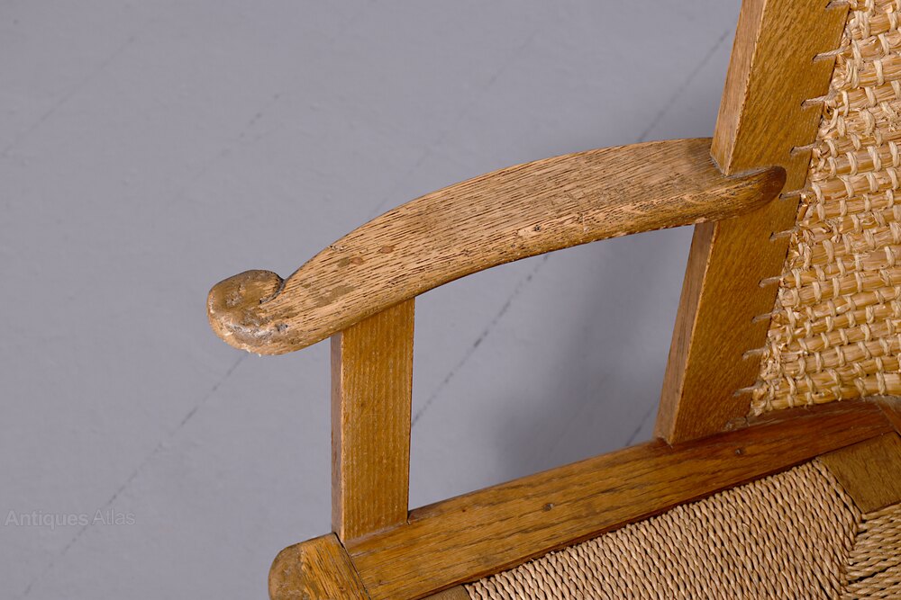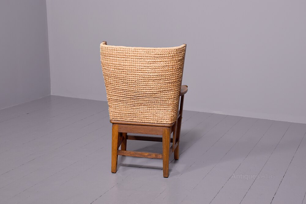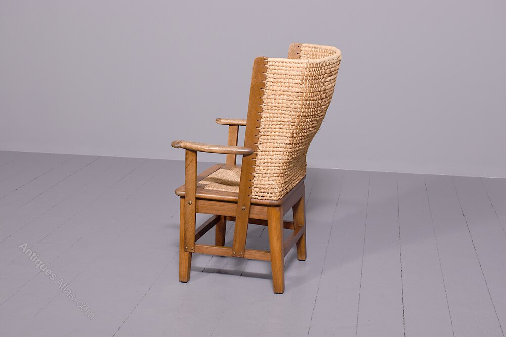 Circa 1900, oak framed, David Kirkness style Orkney chair. With an old straw back, tied together with marram grass and a row of marram grass over the straw at the top. It retains its original drop-in marram grass seat and has a classic Kirkness style curled arm. The arms and back are screwed in place at the sides, with some wear to the arms. Its legs are square and tapering.Size 85cm high x 51cm wide x 38cm deep