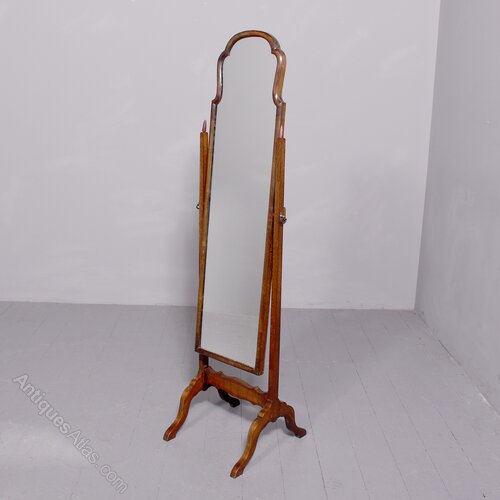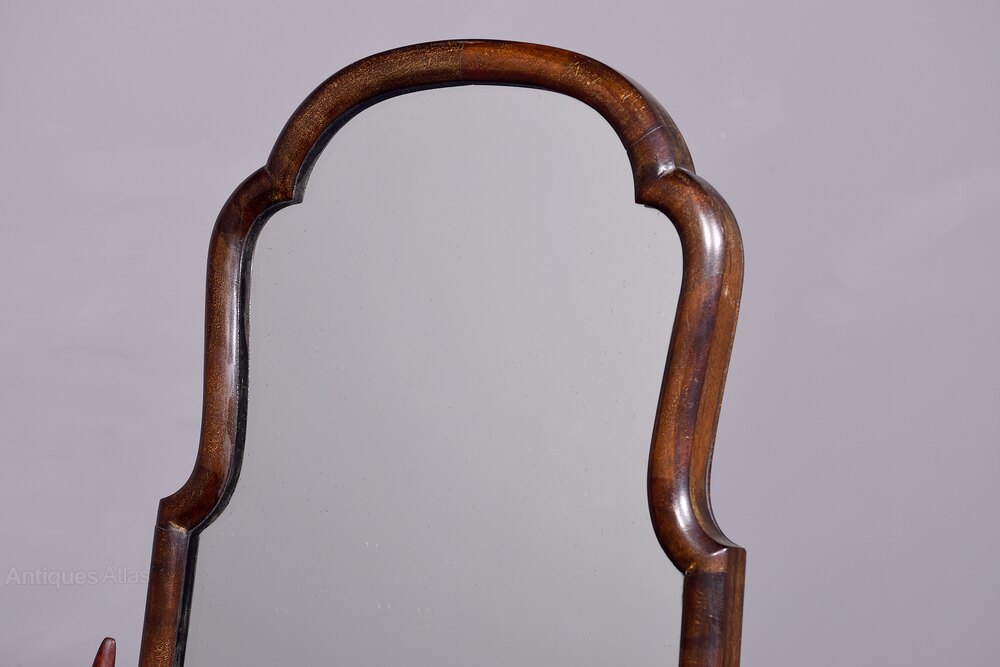 Circa 1930s. A Queen Anne style mahogany framed cheval mirror, the stylish shaped frame with rounded fore-edge, the mirror held in place by two tapering uprights surmounted by very elegant urn shaped finials, the frame held in position by a pair of cast brass axe-head drops, beneath the mirror is a shaped stretcher bracing the two uprights, all resting on four downward facing cabriole legs.159cm High, 40cm Wide
