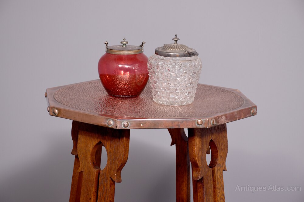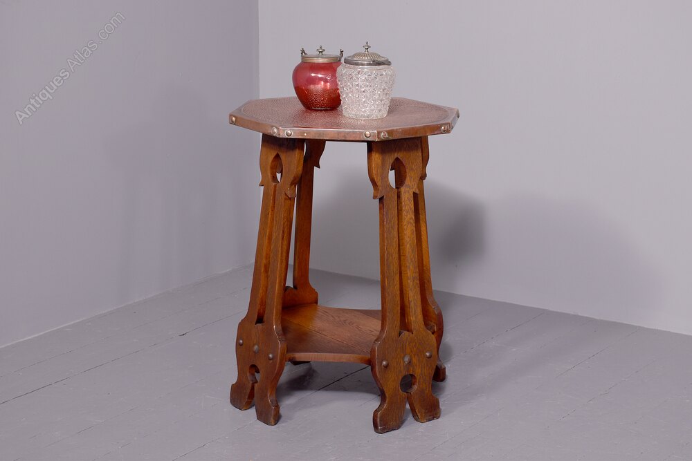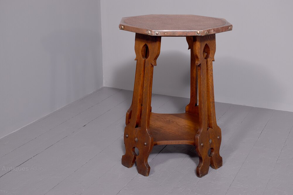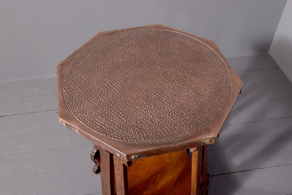 Circa 1900. Quality oak and copper Art Nouveau occasional table, the octagonal table top in copper c with planishing in the form of an animal skin, the copper is folded over the top and held in place with large copper rivets, all resting on four splayed and pierced legs with Art Nouveau motifs on the top and bottom, the legs intersected by a concave shaped shelf with proud roundels to the outside and all resting on shaped foot.73cm High, 53cm Wide, 53cm Deep