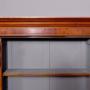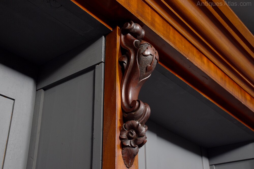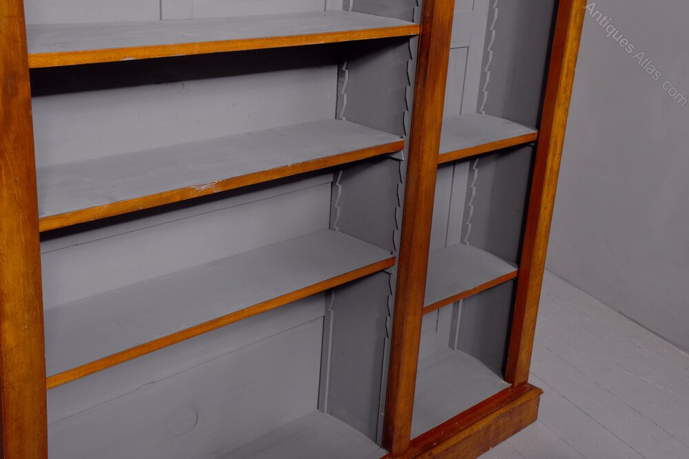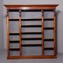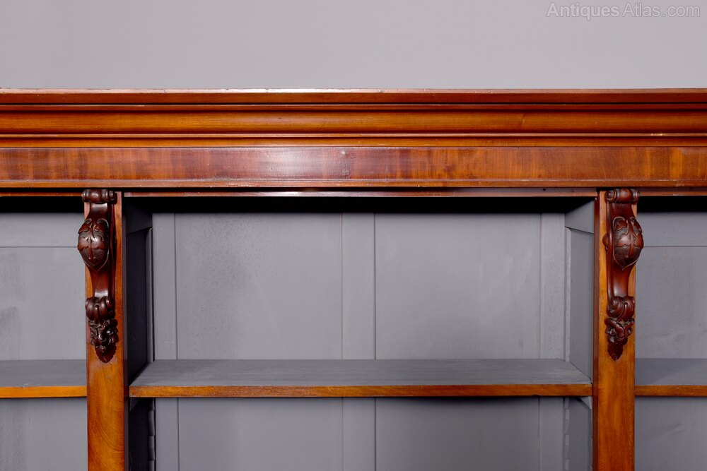 Circa 1860 with adaptations. Quality three-section, mid-Victorian mahogany open bookcase. Surmounted by a molded cornice above a simple cross-banded frieze, the three bookcase sections (wider middle section) and the sides are separated and flanked by figured mahogany pilasters with carved corbels on top and each containing five adjustable shelves. The sides in a beautiful mellow figured mahogany and sitting on a molded and enclosed plinth base. Attractive and functional.216cm Wide x 215cm Tall x 40cm Deep