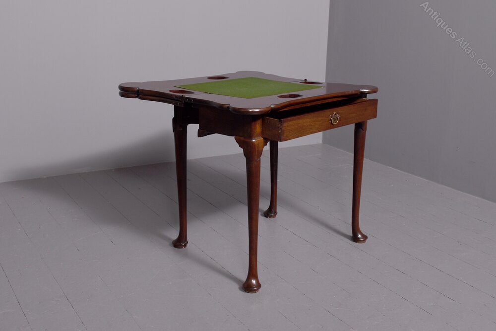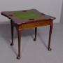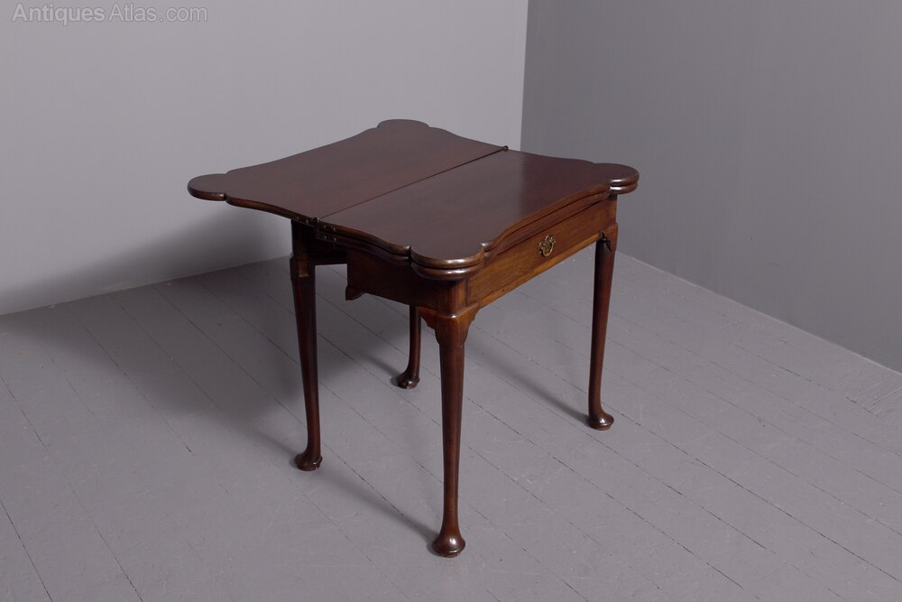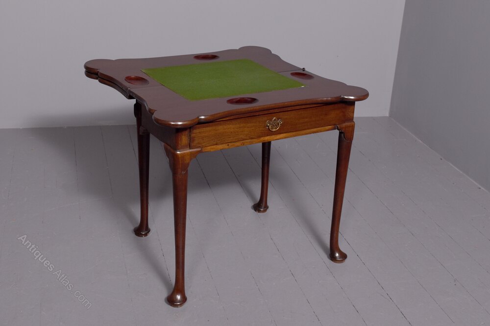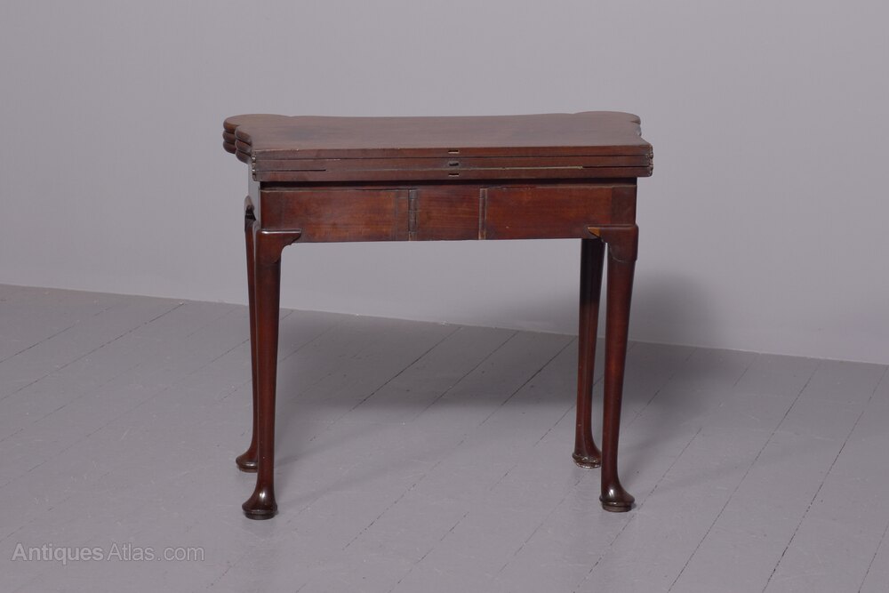 Circa 1760 an early George III mahogany triple top card tea games table, the shaped tops are hinged, inside the first one is a polished mahogany surface(tea table), the second one is lined in baize(card table) with four oval guineas wells, the two back legs are hinged and swing out to support the tops when open, the simple frees at the front with a full length drawer, all resting on four lapped club legs finishing on a simple pad foot.72cm high, 81cm wide,38cm deep
